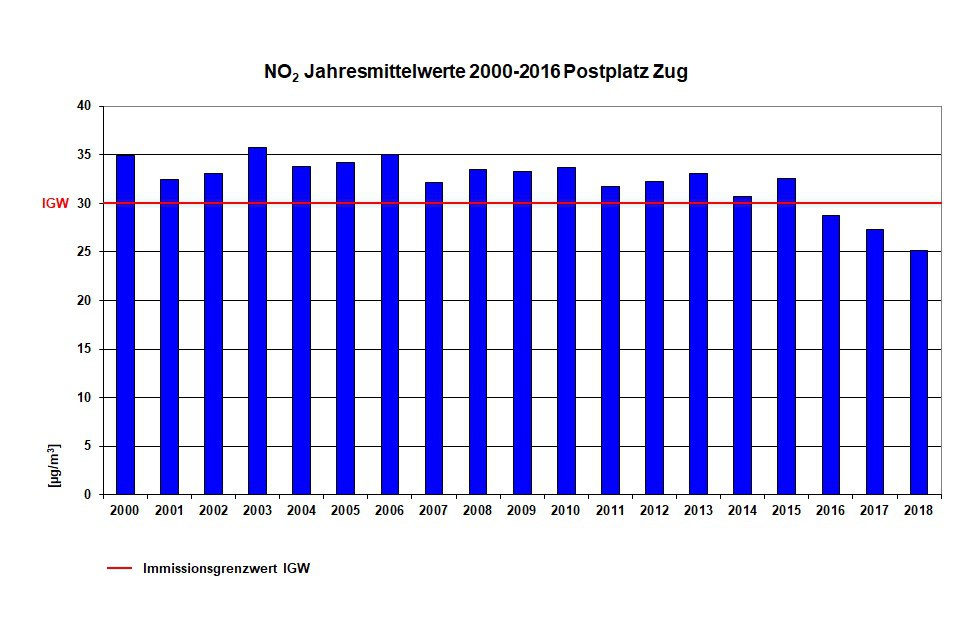 30 µg/m3 (Mikrogramm pro Kubikmeter) als Jahresmittelwert