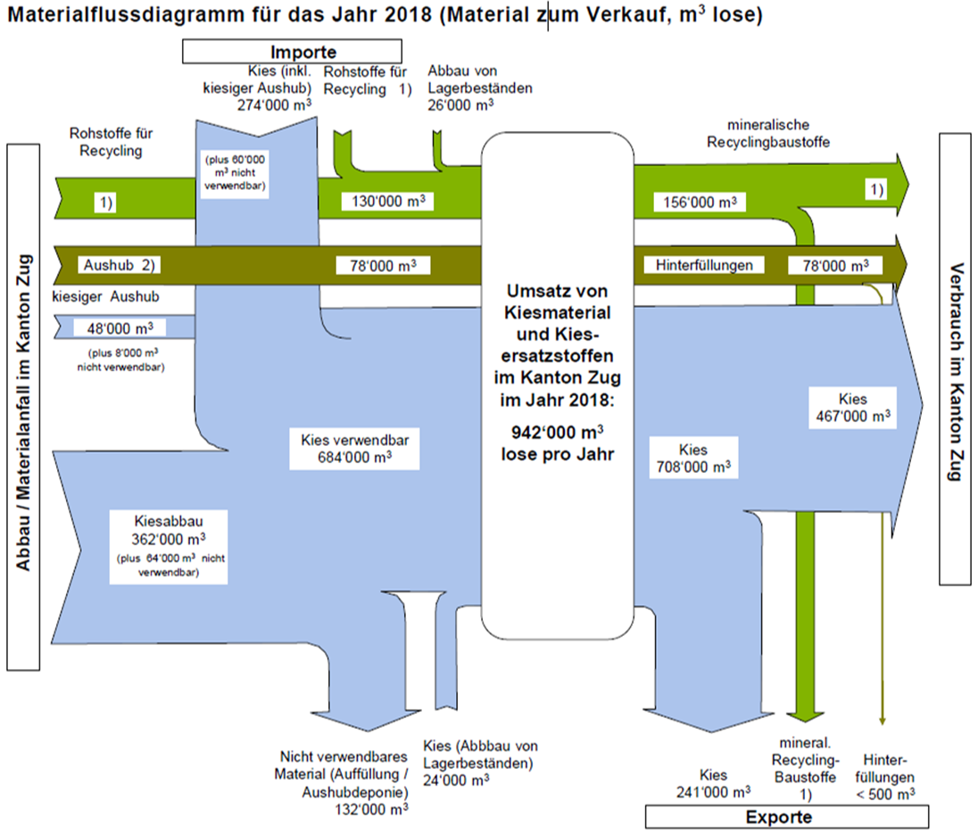 Im Jahr 2018 bauten sämtliche Kieswerke im Kanton Zug rund 362'000 m3 Kies in den Zuger Abbaustellen ab. Diese Abbaumenge liegt im Vergleich zu den Vorjahren markant tiefer, d. h. deutlich unter dem mehrjährigen Durchschnitt von 468'000 m3 Kies. Der Kiesumsatz im Kanton Zug belief sich im vergangenen Jahr auf 708'000 m3. Der Import von Kies in den Kanton Zug betrug im Jahr 2018 rund 39 % des gesamten Kiesumsatzes. Der Anteil der Exporte am Kiesumsatz belief sich auf 34 % des Kiesumsatzes. Daraus resultiert nach zuletzt vier Jahren mit Exportüberschüssen wieder ein Importüberschuss.