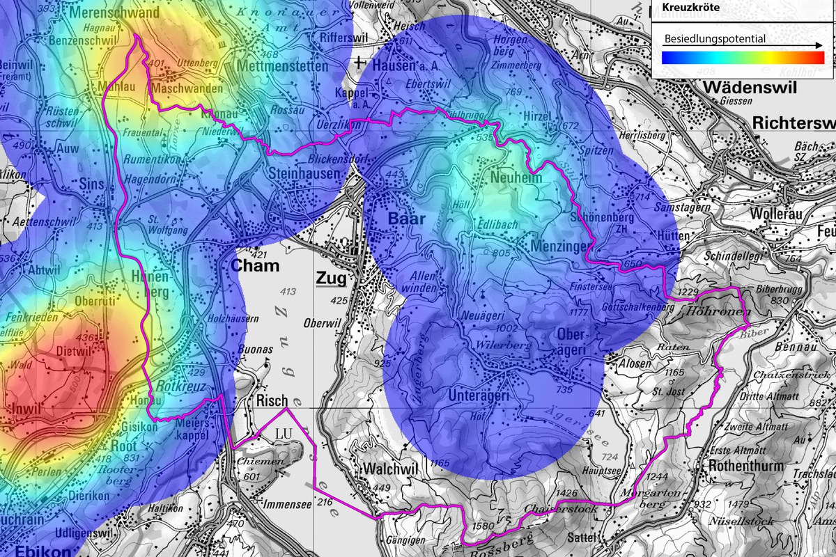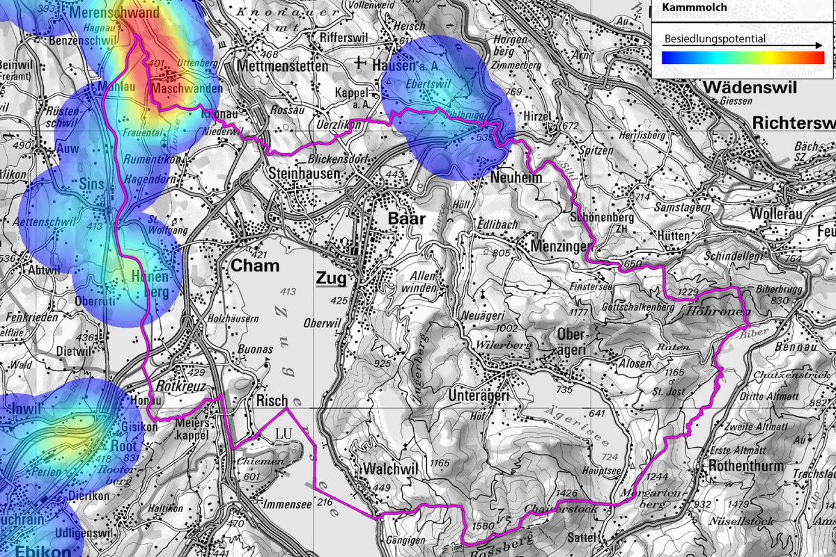 Um zu wissen wo welche Vorrangart gefördert werden kann/soll, wurden aufgrund der bei der karch eingegangenen Amphibienfundmeldungen Karten mit dem Besiedlungspotential gerechnet. Dabei berücksichtigt ist die Aktualität einer Fundmeldung sowie die artspezifischen Wanderdistanzen.