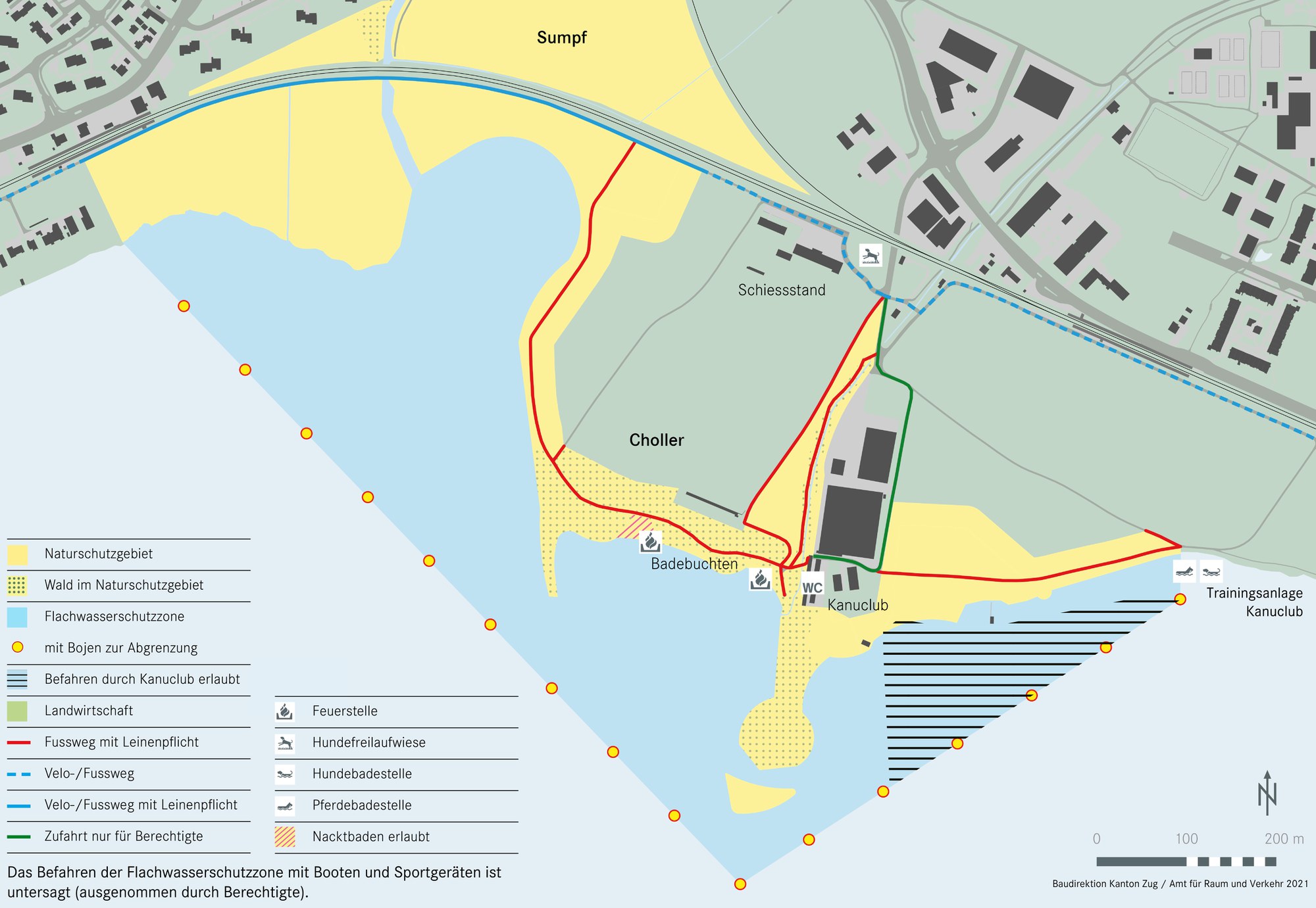 Die Sperrzone darf nicht mit Booten und anderen Schwimmkörpern (Stand Up Brettern, Gummibooten, Luftmatratzen etc.) befahren werden. Ausgenommen von dieser Regelung sind nur Berechtigte. Neben der Berufsfischerei sind dies die Bootshauseigentümer sowie der Kanu-Club. Die Sperrzone ist mit gelben Bojen markiert.