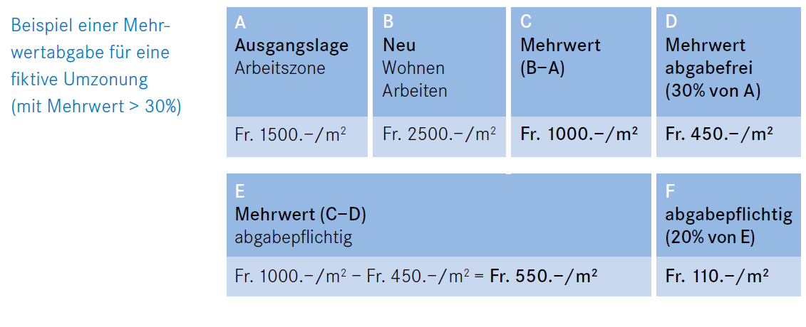 Die Gemeinden können in ihren Bauordnungen festlegen, dass sie mittels verwaltungsrechtlichem Vertrag bei Umzonungen von den Grundeigentümerinnen und Grundeigentümern eine Mehrwertabgabe von maximal 20 Prozent für das den bisherigen Bodenmehrwert von mehr als 30 Prozent übersteigende Mass erheben können. Kommt also der Bodenquadratmeterpreis nach einer Umzonung namentlich von einer bisherigen Arbeits- neu in eine Wohn- und Arbeitszone auf mehr als das Eineinhalbfache des bisherigen Werts zu liegen, kann die Gemeinde gestützt auf einen vorgängig abzuschliessenden verwaltungsrechtlichen Vertrag eine Mehrwertabgabe von maximal 20 Prozent des den bisherigen Bodenmehrwert von mehr als 30 Prozent übersteigenden Masses verlangen. Dasselbe gilt für Aufzonungen und Bebauungspläne mit Erhöhung des Nutzungsmasses. Auch hier ist nur für das die Nutzungserhöhung von mehr als 30 Prozent übersteigende Mass eine Mehrwertabgabe geschuldet. Gleichzeitig soll gewährleistet werden, dass Aufzonungen namentlich von der W1 in die W2 nicht bereits der Mehrwertabgabe unterstellt werden können. Aus diesem Grund ist die Mehrwertabgabe bei Aufzonungen und Bebauungsplänen mit Erhöhung des Nutzungsmasses erst geschuldet, wenn gleichzeitig eine Erhöhung der Ausnützungsziffer von mehr als 0,3 vorliegt. Gilt auf einer aufzuzonenden oder in einem Bebauungsplanperimeter liegenden Bauparzelle als Masseinheit für die Baudichte die Baumassenziffer, ist eine Erhöhung des Nutzungsmasses um 1,2 (ist äquivalent mit dem Vierfachen der Ausnützungsziffer) von der Mehrwertabgabe ausgenommen.