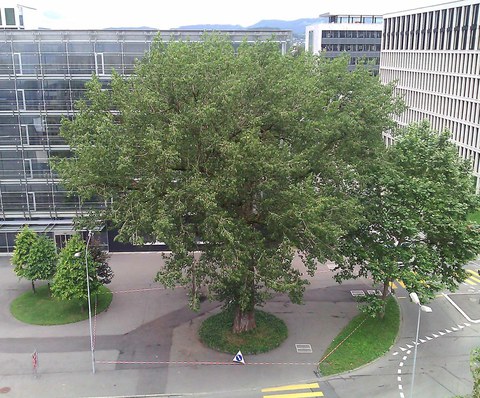 Vor dem Kaufmännischen Bildungszentrum in Zug (KBZ) steht nahe des Kreisels Aabachstrasse / General Guisan-Strasse eine grosse Kanadische Pappel. Ihre stattliche Erscheinung täuscht darüber hinweg, dass der Baum durch Schäden am Stammfuss und am Wurzelwerk geschwächt ist. Ein Hinweis auf den angeschlagenen Zustand sind die zahlreichen Totäste in der Krone, abgestorbene Rinde und lokale Wund-Fäule auf Stossstangenhöhe.