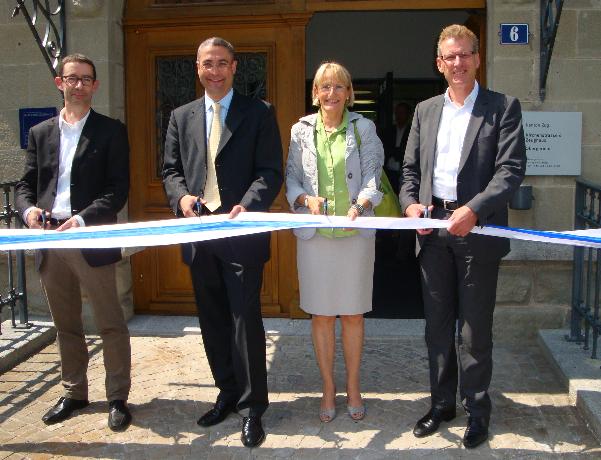 Aufgeräumte Stimmung in den neu gestalteten Räumlichkeiten des Kantonalen Zeughauses Zug: Mit dem Durchschneiden eines Bandes feierten heute Vertretungen von Stadt und Kanton Zug die "Wiederinbetriebnahme" des historischen Baus, der in den vergangenen 15 Monaten sensibel umgebaut wurde und nun für neue Nutzungen zur Verfügung steht. So ist im Sockelgeschoss eine moderne Studienbibliothek für die benachbarte Stadt- und Kantonsbibliothek entstanden, und die neuen Räumlichkeiten in den drei Obergeschossen wird das Obergericht des Kantons beziehen.