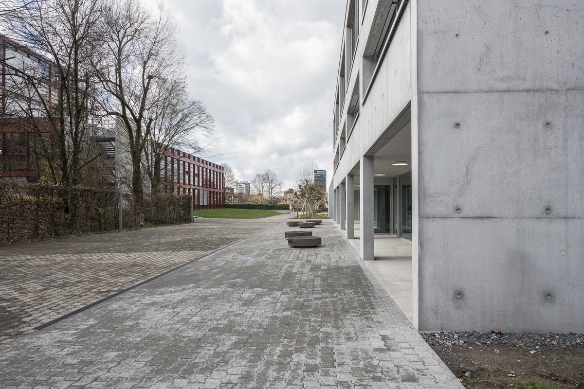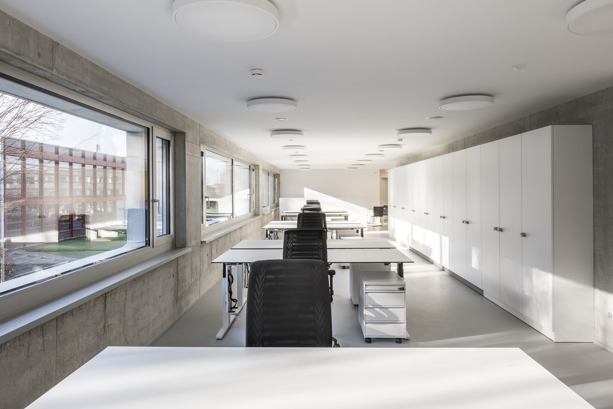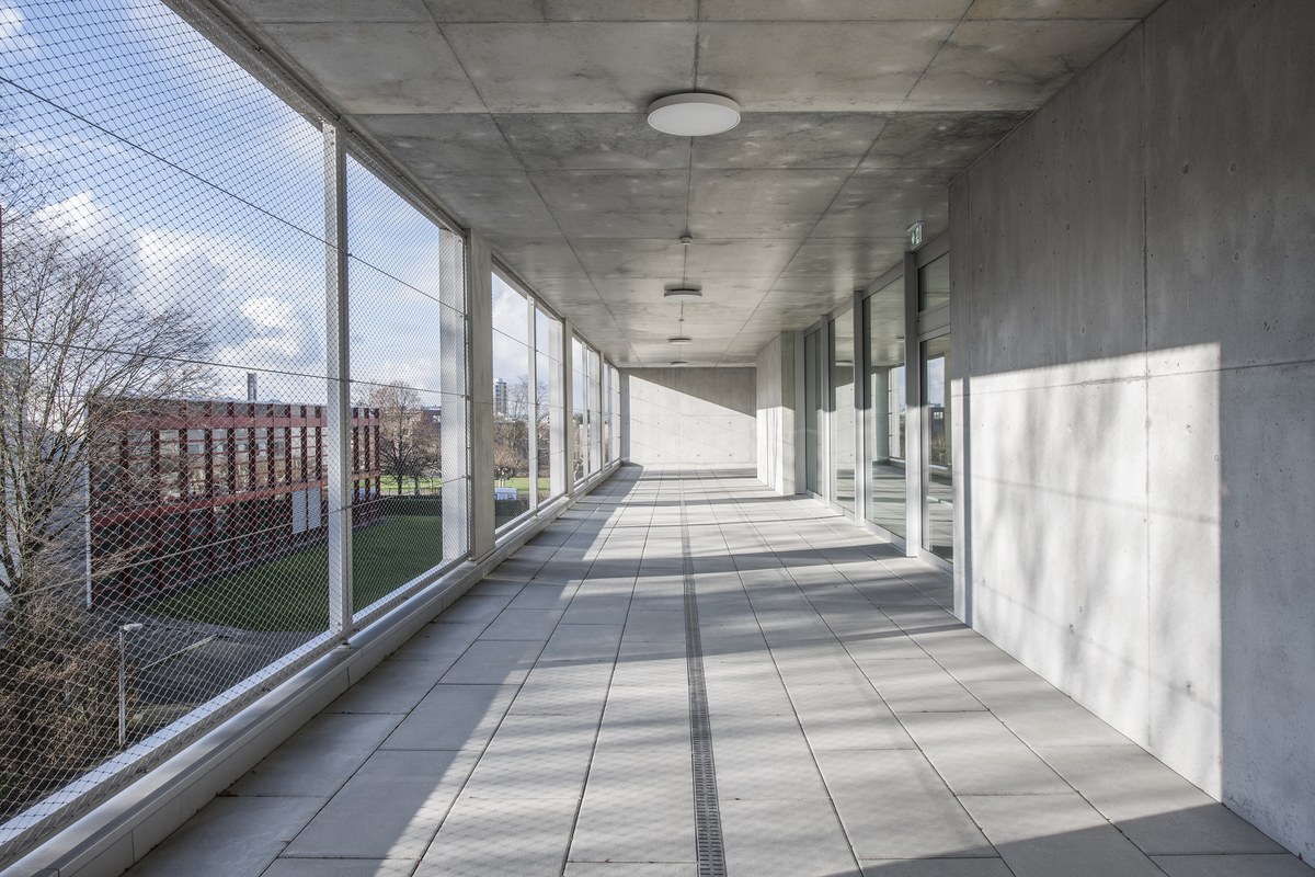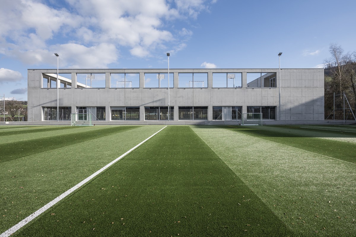 Mit seiner sowohl aussen als auch innen durchgängigen Materialisierung in Sichtbeton orientiert sich das Gebäude ebenfalls am Bestand. Umso stärker heben sich davon die Flächen des Hallen-, Zuschauer- und Garderobebereichs ab, die sich der Farbpalette der Spielfeldmarkierungen bedienen. Wie beim Schulraumprovisorium zeichnete auch hier die Künstlerin Monika Kiss für das Farbkonzept verantwortlich.