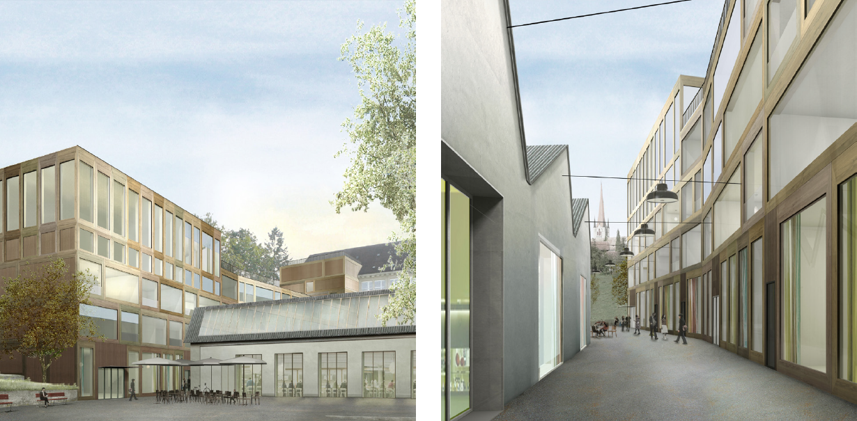 Die bestehenden Altbauten werden auch in Zukunft durch die heutigen Nutzungen belegt und unter Beachtung der denkmalpflegerischen Vorgaben bauphysikalisch ertüchtigt. Fenster, Sonnenschutz und Dachhaut werden ersetzt, die Shedhalle wird innen gedämmt. Zur Erreichung der Erdbebensicherheit dienen das neue Treppenhaus beim Hochbau Süd sowie zusätzliche Aussteifungen im Bereich der bestehenden Treppe.