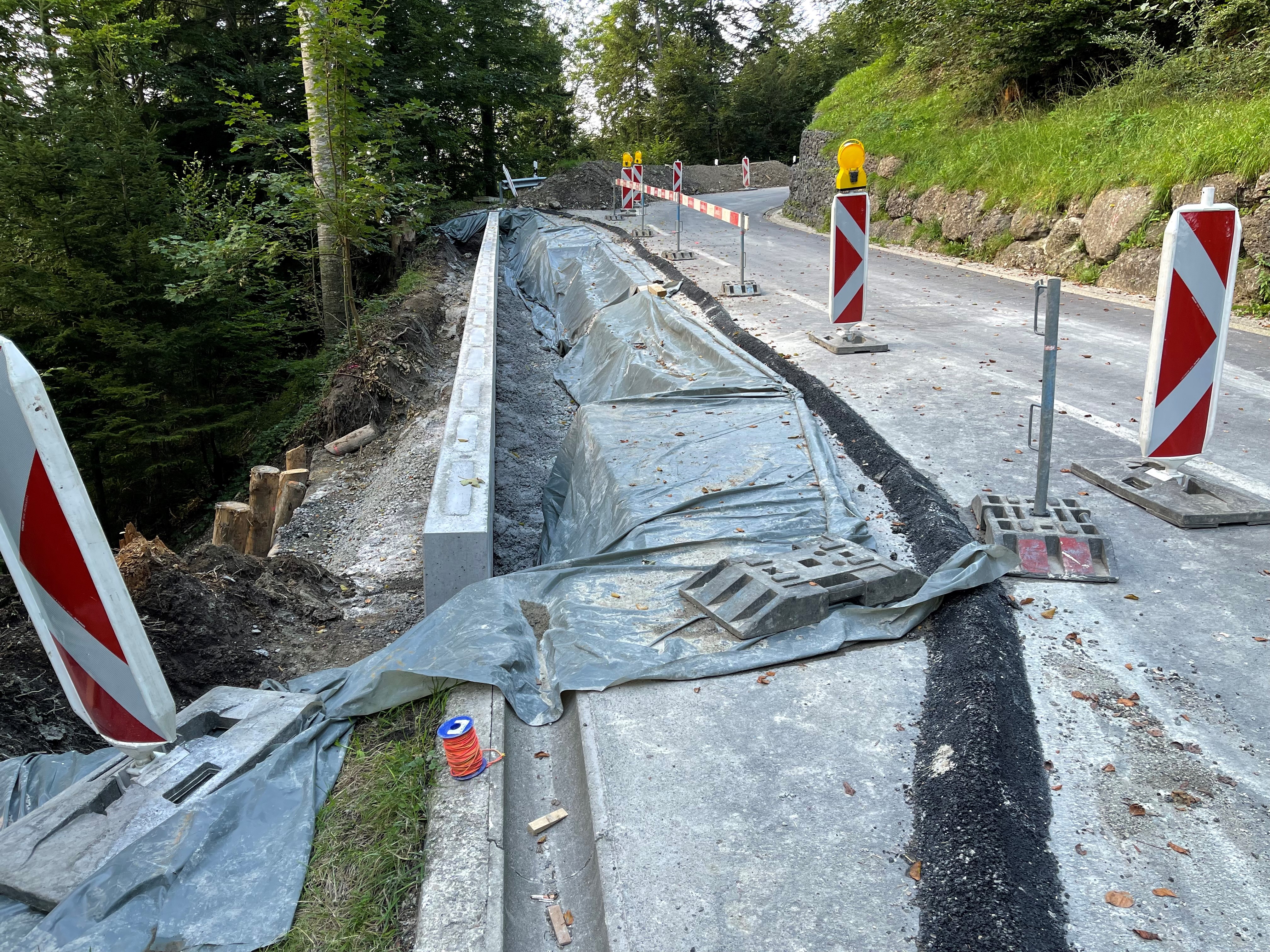 Die Reparaturarbeiten an der Cholrainstrasse schreiten zügig voran. Der Hang ist stabilisiert und kommende Woche wird der Belag eingebaut. Danach wird die Strasse wieder dem Verkehr übergeben.
