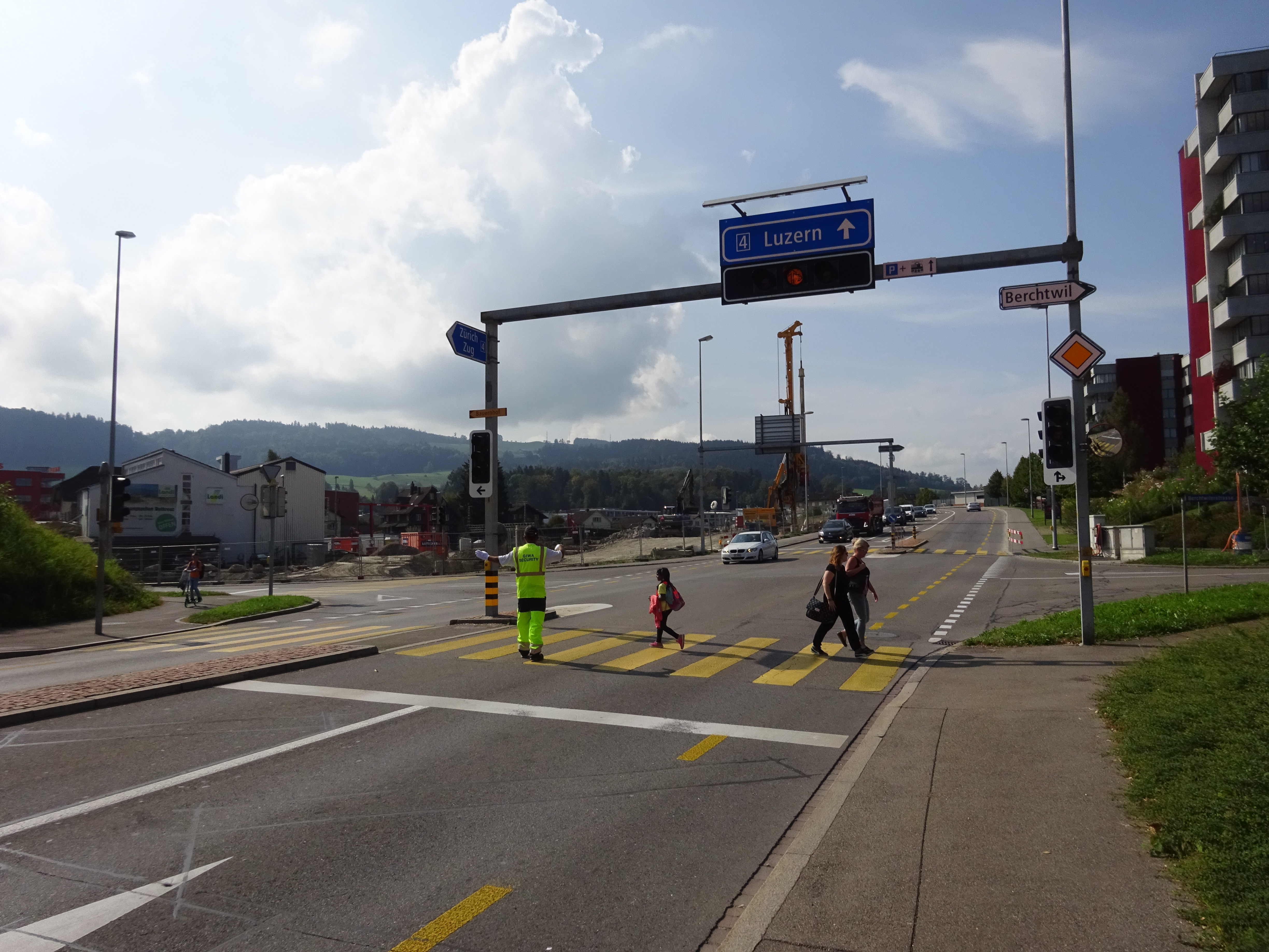 Das Tiefbauamt arbeitet mit Hochdruck an der Lösung zur Einrichtung eines provisorischen Kreisels. Diese Arbeiten können voraussichtlich im November 2020 ausgeführt werden. Danach können die Fussgängerübergänge wieder ohne Verkehrsregelung und ohne Beschränkungen sicher begangen werden. Dies darum, weil die Geschwindigkeit der Fahrzeuge in den Zu- und Wegfahrtsbereichen des Kreisels tief sind.