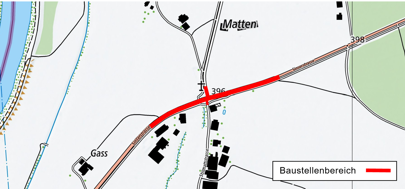 Der Knoten Matten in Hünenberg verbindet die Sinserstrasse mit der Maschwanderstrasse. Die Sinserstrasse weist dort auf einer Länge von rund 400 Metern zahlreiche Belagsschäden und Belagsverformungen auf und auch der Knotenbereich Matten ist diesbezüglich in einem schlechten Zustand. Um die Sicherheit aller Verkehrsteilnehmerinnen und Verkehrsteilnehmer weiterhin gewährleisten zu können, ist eine umfangreiche Instandstellung notwendig. Die Arbeiten umfassen den Ersatz des bituminösen Strassenoberbaus, der defekten Randabschlüsse und die Optimierung der Strassenentwässerung. Als Deckschicht wird ein lärmarmer Belag eingebaut. Die ehemaligen Bushaltestellen «Matten» sind seit längerer Zeit nicht mehr in Betrieb und werden rückgebaut. Die dadurch gewonnenen Flächen werden ökologisch aufgewertet und mit einer Magerwiese begrünt.