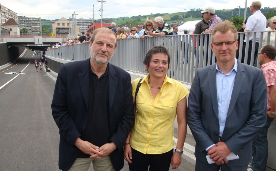 Mit ihrer einspurigen Bahnunterführung war die Feldstrasse in Zug ein oft beklagtes Nadelöhr im städtischen Verkehrsnetz. Nun ist diese Engstelle beseitigt und die Feldstrasse ein leistungsfähiger Zubringer zur Autobahnverbindung Nordzufahrt Zug. Baudirektor Heinz Tännler, Stadtpräsident Dolfi Müller und Stadträtin Andrea Sidler Weiss haben das Bauwerk heute eröffnet.