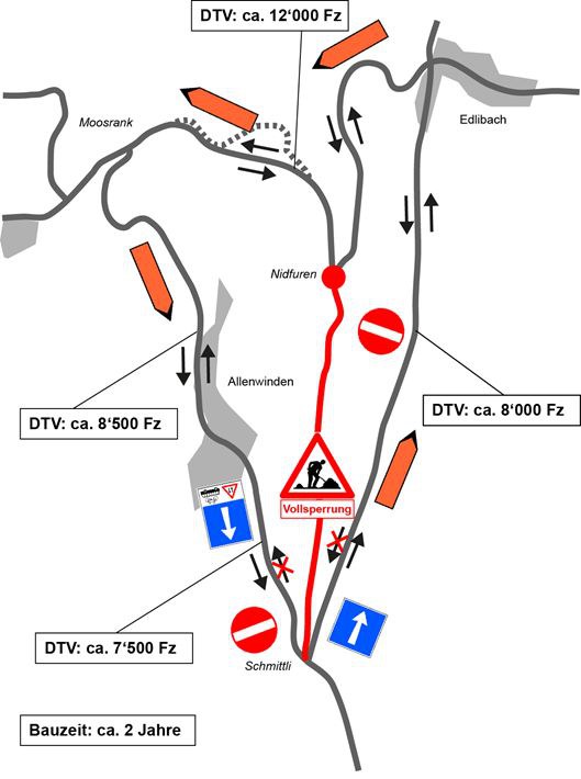 Das Umleitungskonzept für den Ausbau des Abschnitts zwischen Nidfuren und Schmittli sieht vor, den Verkehr bergwärts über Allenwinden und talwärts über Cholrain-Edlibach umzuleiten. So können die Bauarbeiten in möglichst kurzer Zeit ausgeführt werden, ohne dass die ansässige Bevölkerung übermässig belastet wird. Zudem bleibt die Erreichbarkeit der umliegenden Gemeinden gewährleistet. Die Fahrzeitverluste werden gering sein. Dies ist insbesondere für den öffentlichen Verkehr und für die Blaulichtorganisationen von grosser Bedeutung.
