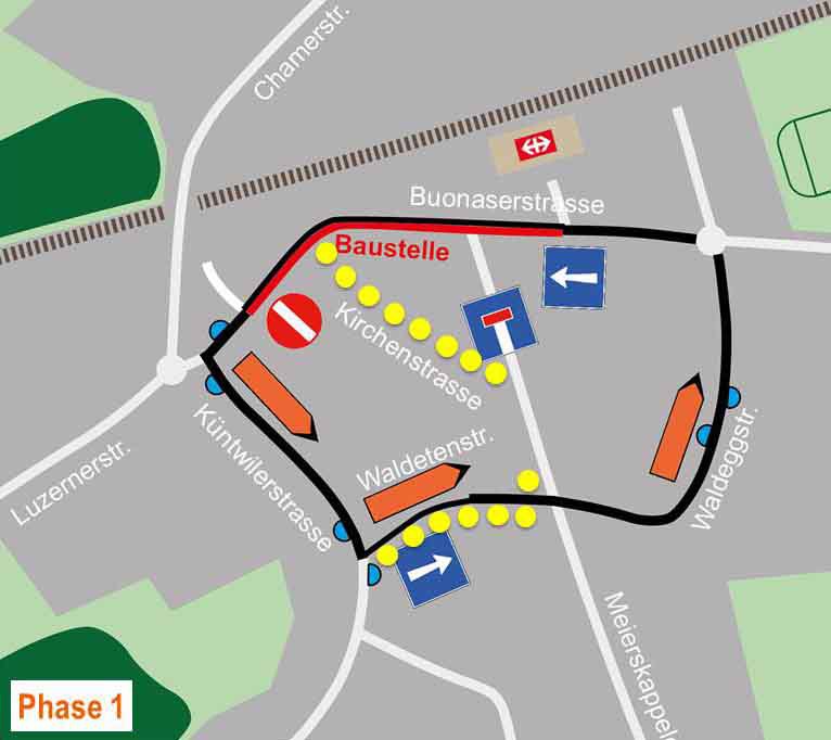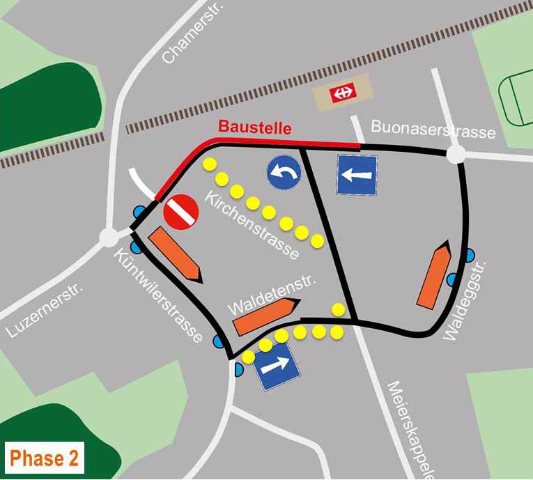 In den Phasen 1 und 2 sind die Kirchenstrasse und die Waldetenstrasse (gelb) als Schulwege zu benützen. Das Trottoir entlang der Waldetenstrasse wird während der Verkehrsumleitung von der Strasse baulich abgetrennt. Am Kreuzplatz kommen zu Beginn jeder Umleitungsphase Verkehrslotsen zum Einsatz.