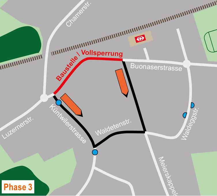 Während der Bauzeit bleiben die Luzerner- und die Buonaserstrasse zwischen dem Kreisel Lindenplatz und dem Bahnhof Rotkreuz in Fahrtrichtung Bahnhof gesperrt. Die Umleitung erfolgt in Form eines Grosskreisels über die Strecke Küntwiler-, Waldeten- und Waldeggstrasse zur Buonaserstrasse. Nicht betroffen von den Umleitungen sind die Parkhäuser Gössimatte und Arkadenhof. Sie bleiben durchgehend in Betrieb. Was den Busbetrieb betrifft, ergibt sich nur für die Linie 52 eine Änderung, indem die Zufahrt zum Bahnhof Süd über die Waldeten- und Waldeggstrasse erfolgt. Die Haltestelle beim Lindenplatz wird an die Küntwilerstrasse verlegt und die Haltestelle Waldetenstrasse um einige Meter verschoben.