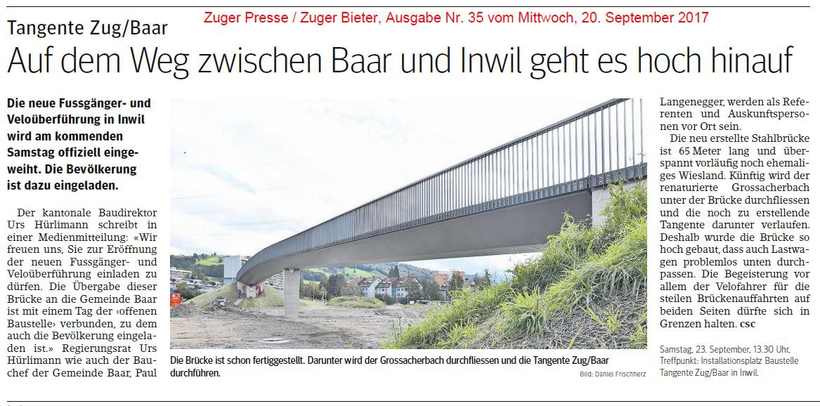 20.09.2017Eröffnung der Fussgänger- und VelobrückeDie neue Fussgänger- und Veloüberführung in Inwil wird am kommenden Samstag offiziell eingeweiht. Die Bevölkerung ist dazu eingeladen.https://publisher-zgch-test.webcloud7.ch/izug/platform/behoerden/baudirektion/tiefbauamt/ausgefuehrte-projekte/tangente/unterlagen/Pressespiegel/eroeffnung-der-fussgaenger-und-velobruecke-1https://publisher-zgch-test.webcloud7.ch/izug/platform/logo.png