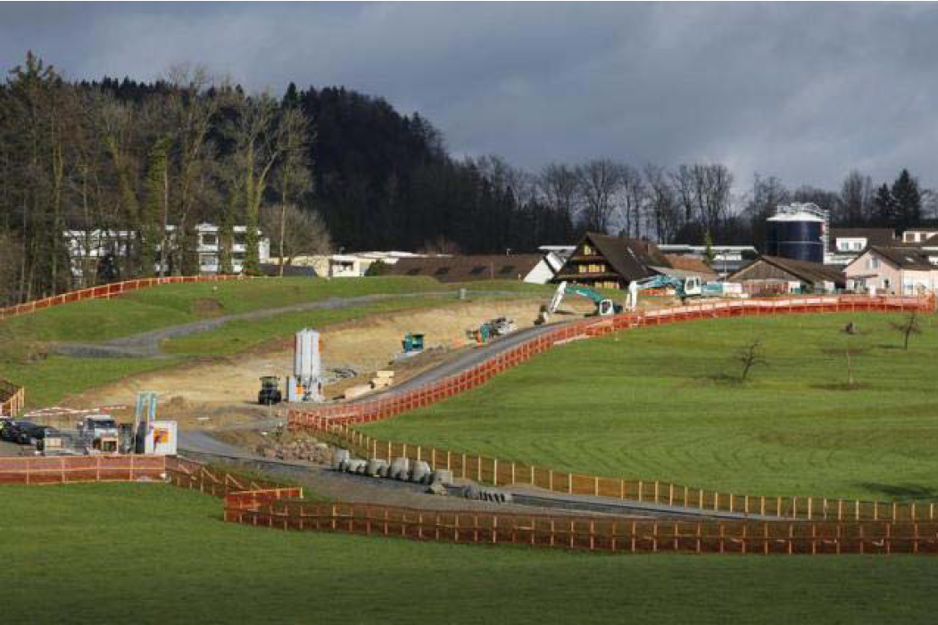 Baar; Der Verlauf der Tangente Zug/Baar ist im Gelände bereits deutlich erkennbar. Jetzt starten die Vorarbeiten für den Geissbüel-Tunnel. Er wird 370 Meter lang und wird im Tagbau erstellt.