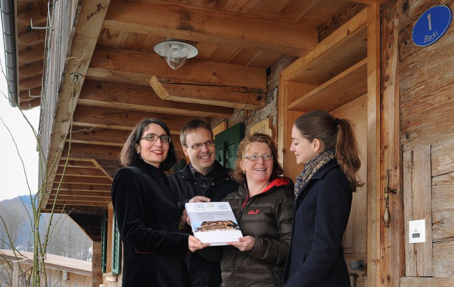 Foto: v.L.n.R.: Regierungsrätin Manuela Weichelt-Picard, Edgar und Ursula Mahler-Henggeler und die Archäologin Anette Bieri. Familie Mahler aus Unterägeri hat ihr Haus, welches bereits 1510 errichtet wurde vor fünf Jahren restauriert. © Amt für Denkmalpflege und Archäologie, Direktion des Innern des Kantons Zug.