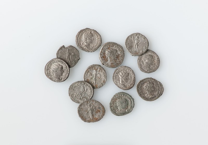 Die Münzen lagen eng beieinander, was darauf hinweist, dass sie sich ursprünglich in einem Behältnis aus einem vergänglichen Material befunden haben dürften, z.B. in einem Beutel aus Stoff oder Leder oder in einem Holzgefäss. Die Münzen wurden im Namen verschiedener Kaiser und einer Kaiserin geprägt und können in die Zeit zwischen 241 und 255 nach Christus da-tiert werden. Bei den zwölf Münzen handelt es sich um sogenannte Antoniniane.