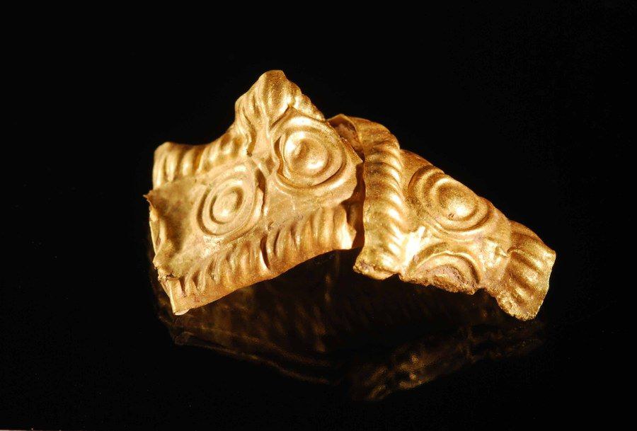 Gefaltetes, verziertes Goldblechband mit Brandspuren aus einem spätbronzezeitlichen Steinkistengrab. Die Art der Verzierung ist typisch für die raren Goldfunde der Spätbronzezeit. Eine ähnliche Verzierung findet sich auf einem als Diadem interpretierten Goldblech aus einem Frauengrab, das in Binningen (BL) geborgen wurde.