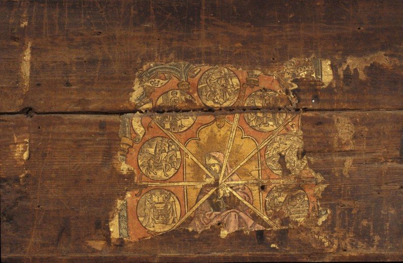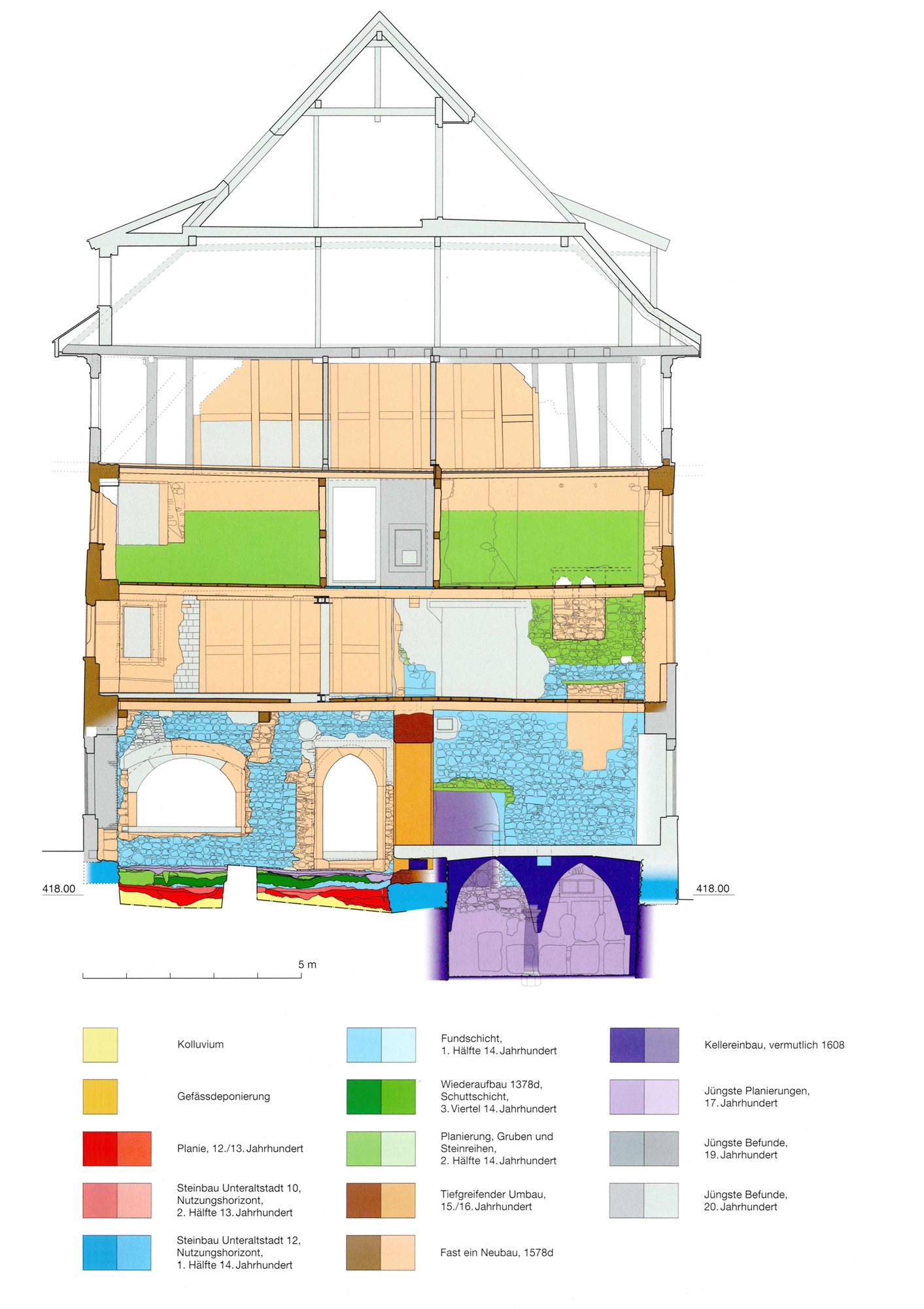 Mit der Errichtung des Gründungsbaus dürfte im Frühjahr 1420 begonnen worden sein. Damit handelte es sich um das älteste bekannte Wohnhaus in der Gemeinde Baar und um den ältesten Ständerbau im Kanton Zug ausserhalb des Stadtgebiets. Ausserordentliche Malereien an den Stubenwänden geben einen einmaligen Einblick in die ländliche Lebenswelt zur Reformationszeit. Die auf dem Foto abgebildete Bohlenwand zeigt eine Bildkomposition mit einem Zuger Fahnenträger sowie die Heiligen St. Martin und St. Eligius. Nach der Dokumentation vor Ort wurden die noch vorhandenen Bauelemente des Gründungsbaus sorgfältig abgebaut und ins Depot des Amtes für Denkmalpflege und Archäologie gebracht. Die Wandmalereien wurden behutsam konserviert und restauriert (Tugium 31/2015).