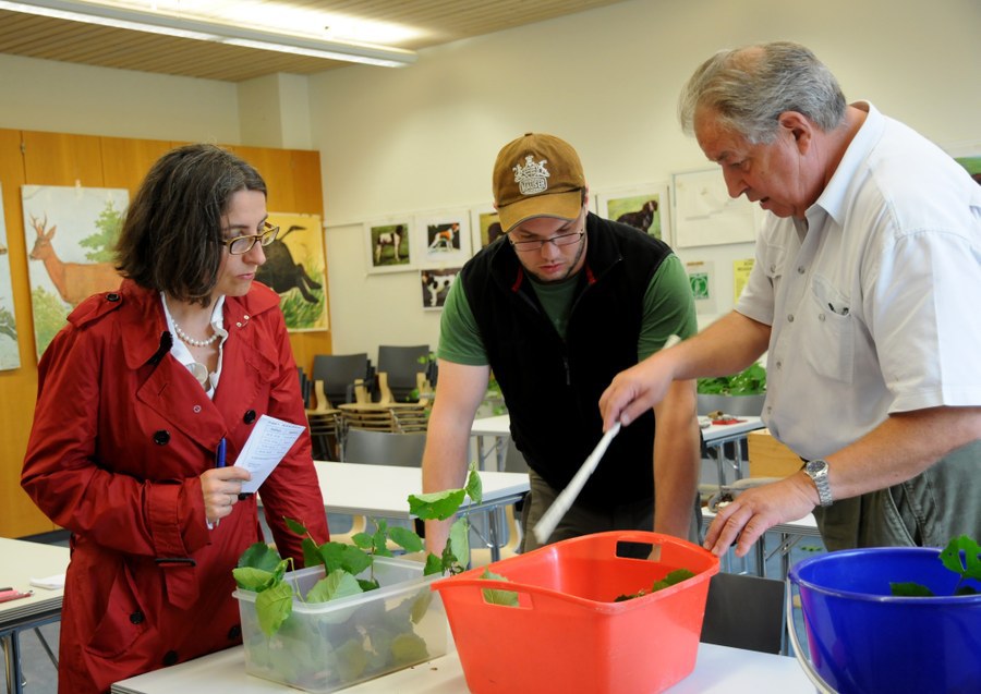 Foto 1: Prüfung im Fach Jagdkunde, Beurteilung einer Tierspur. V.l.n.r. Regierungsrätin Weichelt-Picard, Jägerkandidat Michael Arnold und Prüfungsexperte Ueli Eicher