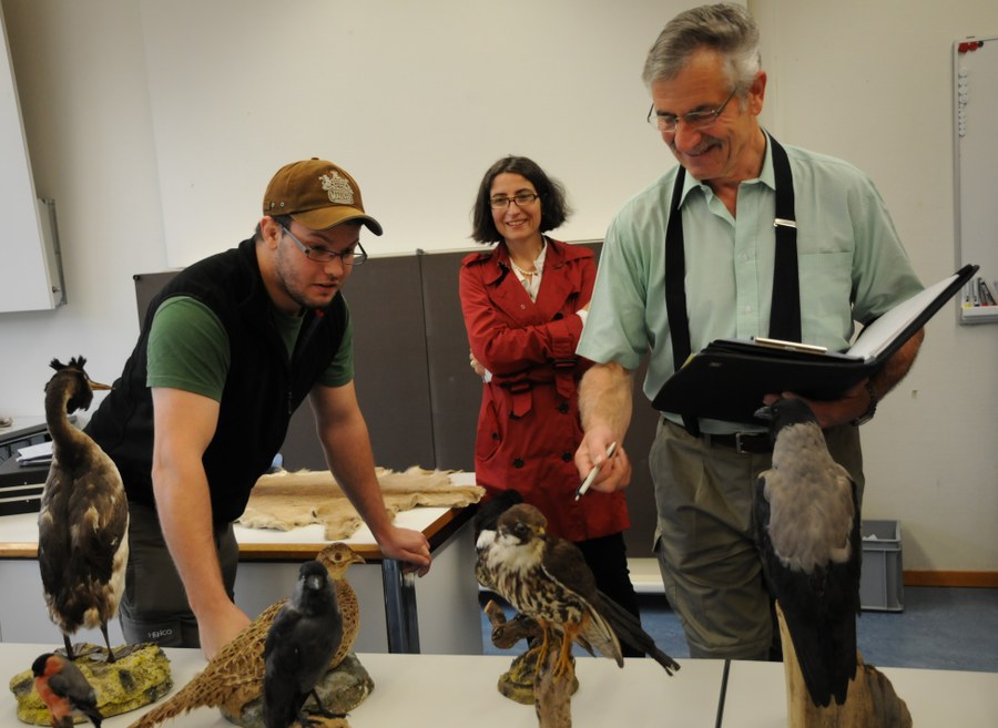 Foto 2: Prüfung im Fach Wildkunde, Vogelartenkenntnis. V.l.n.r. Jägerkandidat Michael Arnold, Regierungsrätin Weichelt-Picard und Prüfungsexperte Hans Häusler