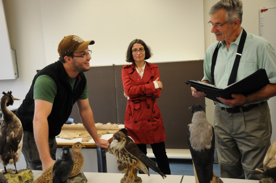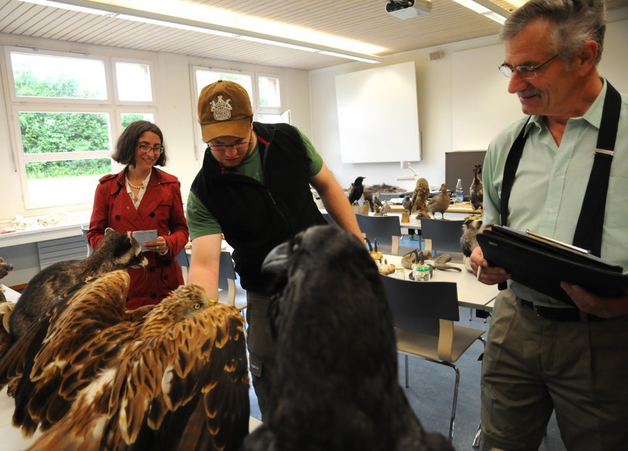 Foto 3: Prüfung im Fach Wildkunde, Vogelartenkenntnis. V.l.n.r. Jägerkandidat Michael Arnold, Regierungsrätin Weichelt-Picard und Prüfungsexperte Hans Häusler