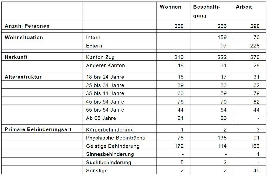 Am meisten genutzt werden die Angebote von Menschen mit einer geistigen Behinderung (49 %) gefolgt von Menschen mit psychischen Beeinträchtigungen (42 %). Am Stichtag der Evaluation Ende Dezember 2011 haben 583 Personen ein Wohn-, Beschäftigungs- oder Arbeitsangebot der sechs oben genannten sozialen Einrichtungen genutzt. Der Anteil ausserkantonaler Personen in Zuger Einrichtungen macht 12 % (68 Personen) aus. Die meisten stammen aus Zentralschweizer Kantonen. Demgegenüber wohnen und / oder arbeiten 136 Zugerinnen und Zuger mit Behinderung in ausserkantonalen Einrichtungen.
