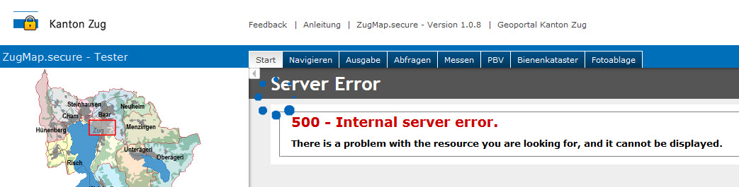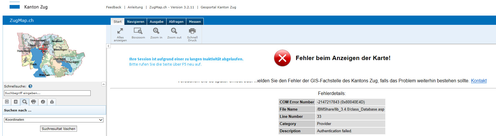 Aus Sicherheitsgründen trennt der ZugMap-Server nach einer gewissen Zeit die Verbindung zu ihrem Client. Wenn Sie nach dieser Zeit eine Aktion im ZugMap (z.B. Zoom in) machen, gibt es eine Fehlermeldung.