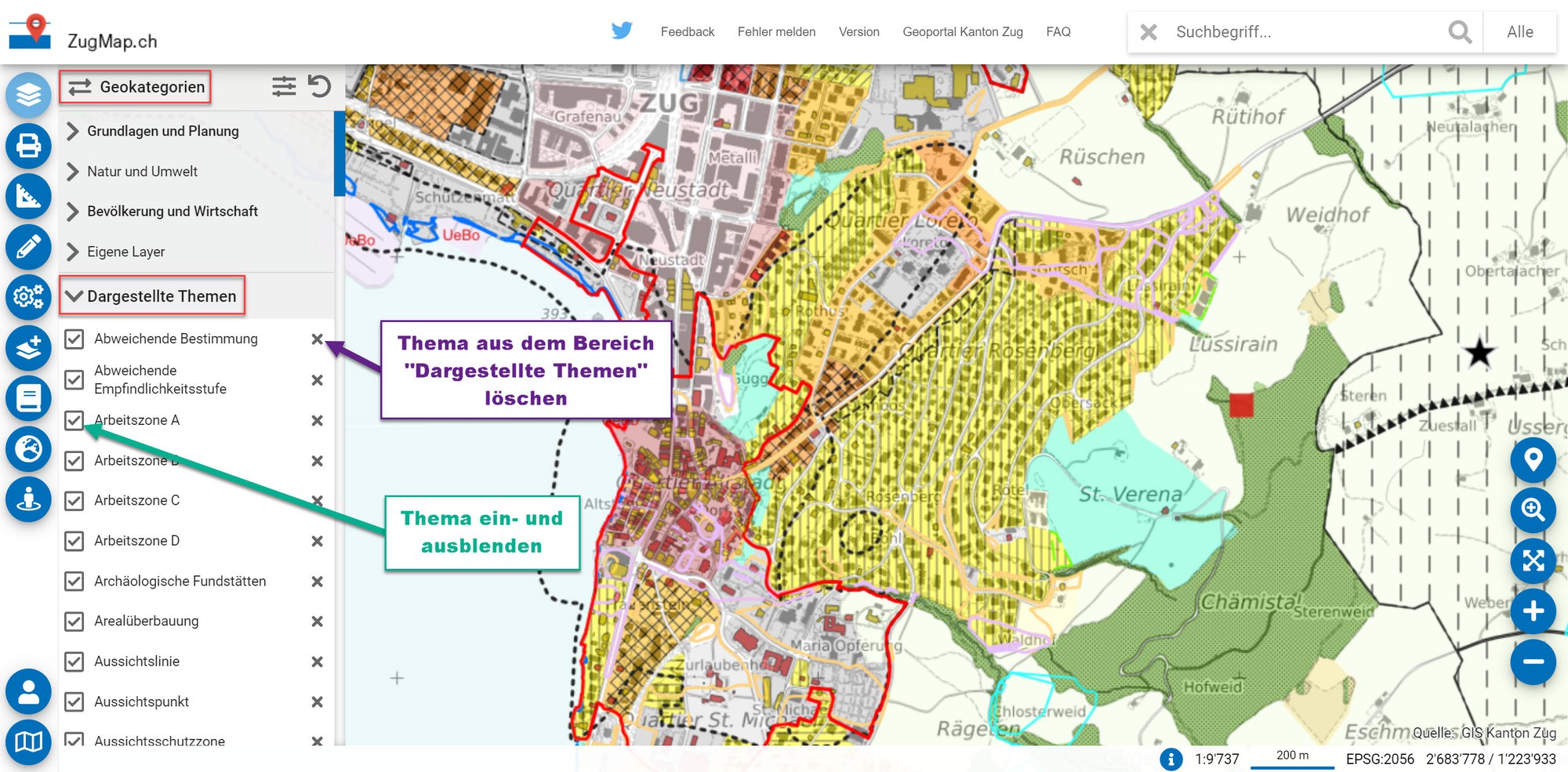 Wie erkenne ich in ZugMap, welche Themen ich eingeschaltet habe?