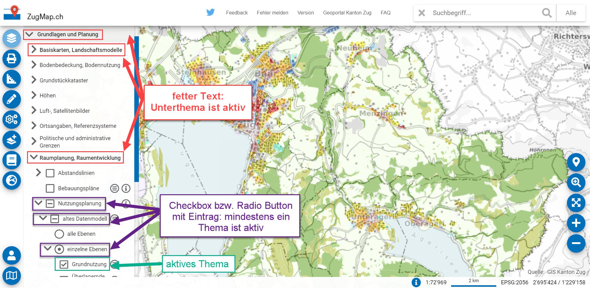 In der Kartenlegende wird der Text fett dargestellt oder die Checkbox bzw. der Radio Button einer Themengruppe mit einem Eintrag versehen, wenn mindestens ein Thema aus dieser Themengruppe dargestellt wird.