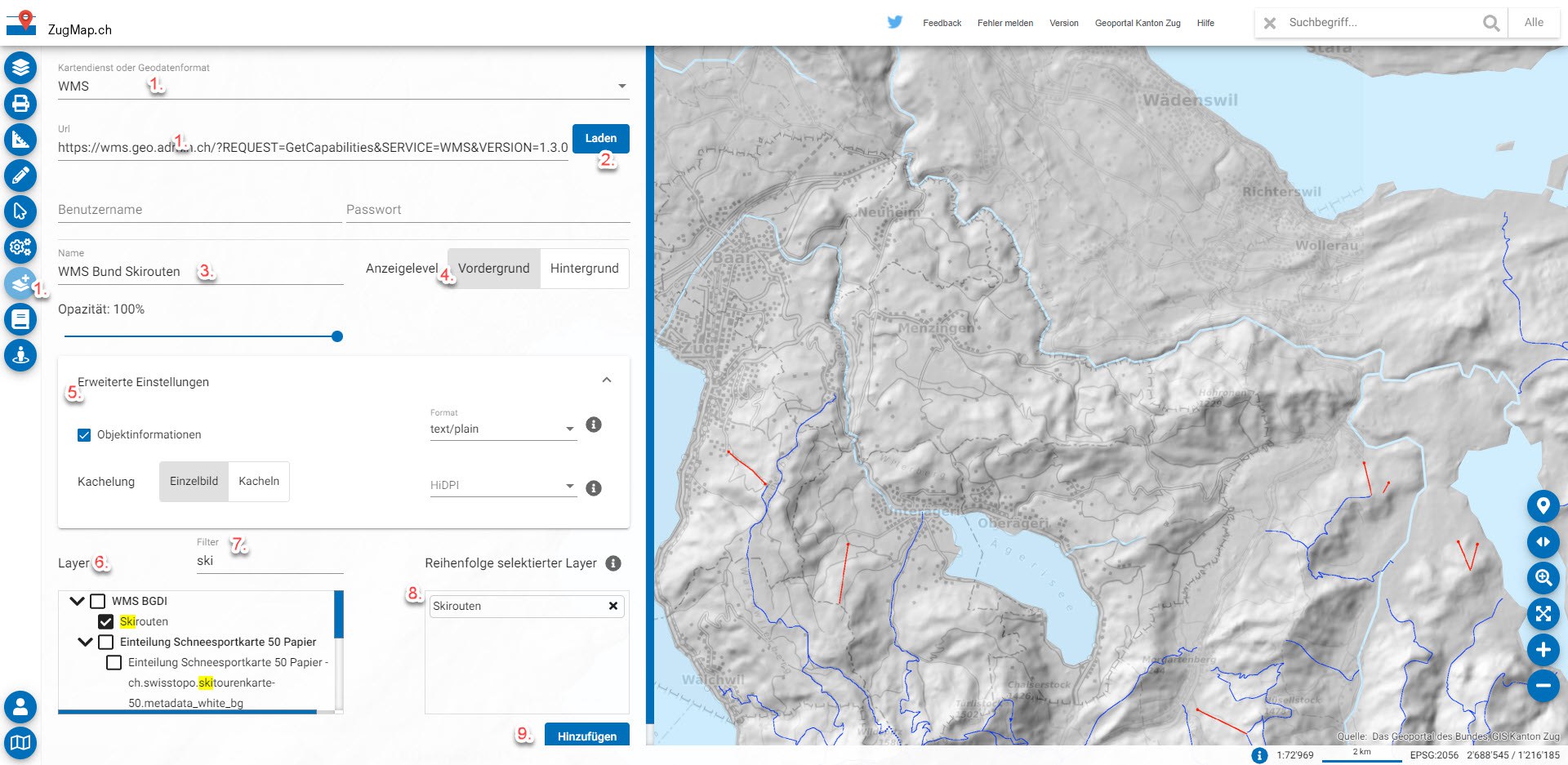 OGC-Dienste mit der Funktion "Layer einbinden" definieren und im Kartenfenster darstellen.