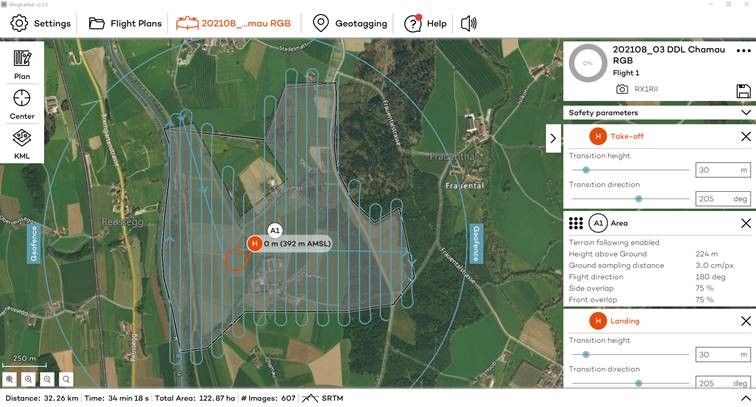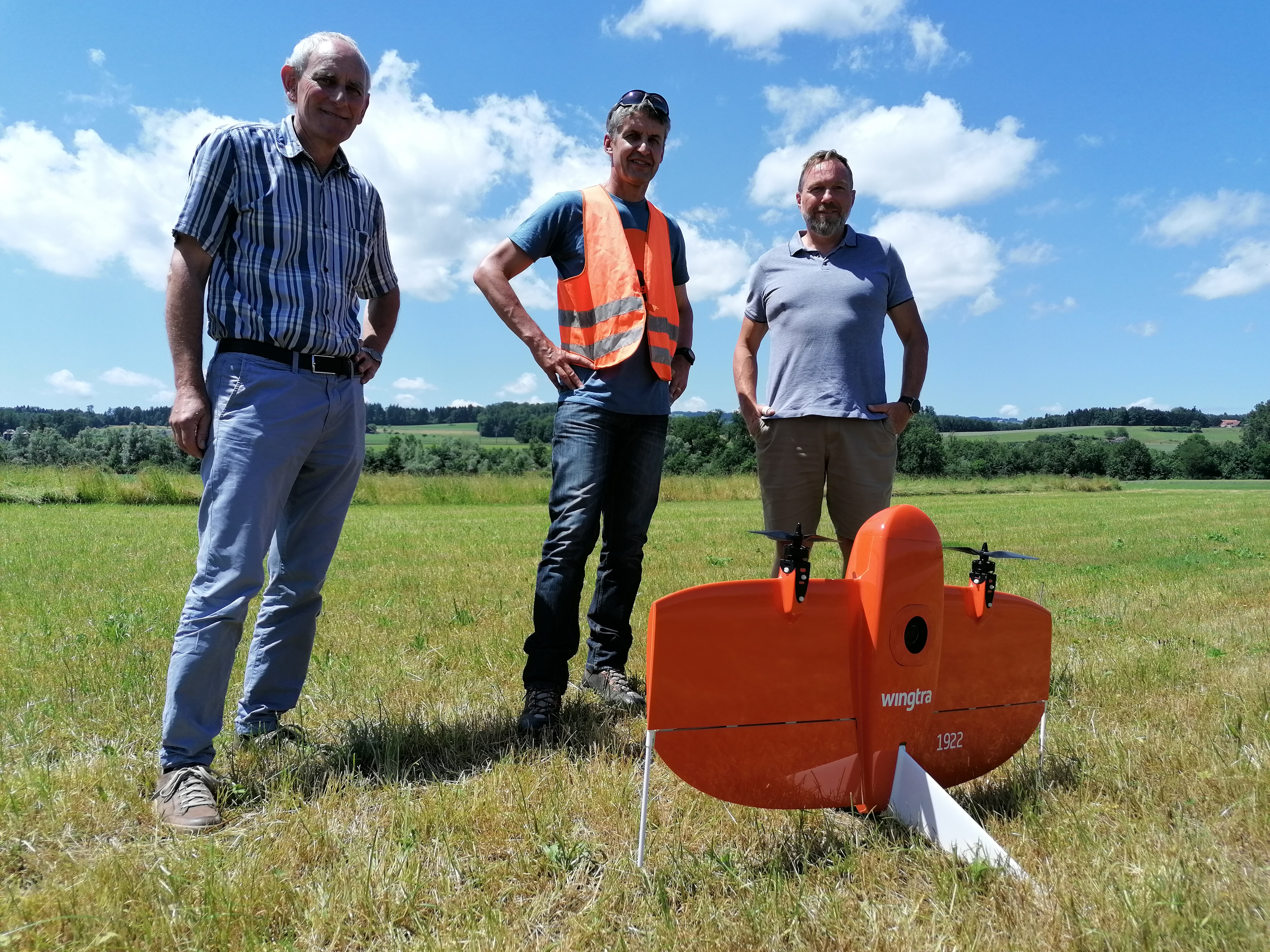 Beim Fluggerät handelt es sich um ein Kleinflugzeug (Drohne) mit der Bezeichnung «WingtraOne [1922]». Die Drohne mit einer Flügelspannweite von 1.25 Metern startet senkrecht, geht dann in den Horizontalflug über und landet nach erfolgter Mission wieder senkrecht. Ein Flug wird im Voraus genau geplant und verläuft dann vollständig autonom. Flughindernisse und Beschränkungen müssen dabei berücksichtigt werden. Als Sensoren stehen für so genannte RGB-Bilder (Bilder im Farbspektrum Rot, Grün, Blau) eine handelsübliche Kleinbildkamera mit 42 Megapixel Bildsensor oder für multispektrale Bilder eine Multispektralkamera mit sechs verschiedenen Kanälen zur Verfügung. Mit der dazugehörigen Software erstellt die Abteilung Vermessung des Amts für Grundbuch und Geoinformation (AGG) aus den Luftaufnahmen präzise Orthobilder, 3D-Oberflächenmodelle oder fotorealistische 3D-Ansichten. Multispektralaufnahmen ermöglichen beispielsweise Aussagen über den Vegetationszustand und Anomalien. Auch thermische Bilder können erstellt und dem Situationsplan überlagert werden.