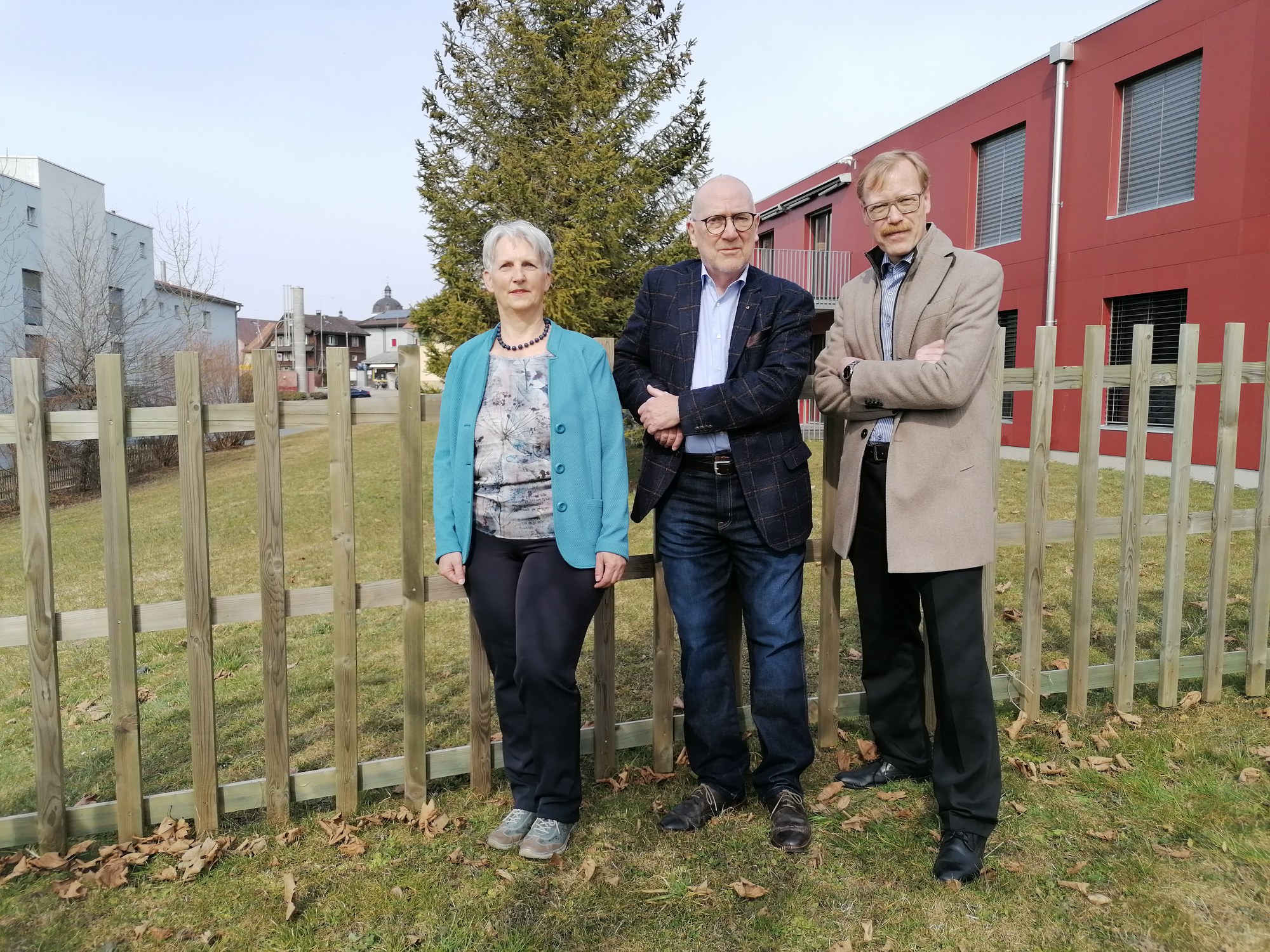 Susan Staub-Matti (Gemeinderätin Menzingen, Vorsteherin der Abteilung Soziales und Gesundheit), Jürg Brändli (Präsident der gemeinnützigen Aktiengesellschaft Luegeten AG) und Regierungsrat Andreas Hostettler sind froh, dass der «Luegeten»-Pavillon Geflüchteten aus der Ukraine zur Verfügung gestellt werden kann. Fotos 1-3 im Anhang: Sabine Windlin