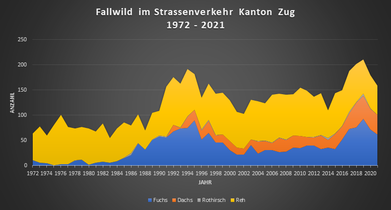 Wildtiere gehören aufgrund ihres Verhaltens zu den häufigsten Verkehrsopfern. Im letzten Jahr kamen so im Kanton Zug 159 Tiere zu Tode. Angefahrene Tiere flüchten häufig verletzt in Deckung und verenden nicht selten qualvoll. Eine unverzügliche Meldung von Unfällen vermindert nicht nur unnötiges Leid, sondern ist eine Pflicht. Das Missachten der Meldepflicht führt zu rechtlichen Konsequenzen.
