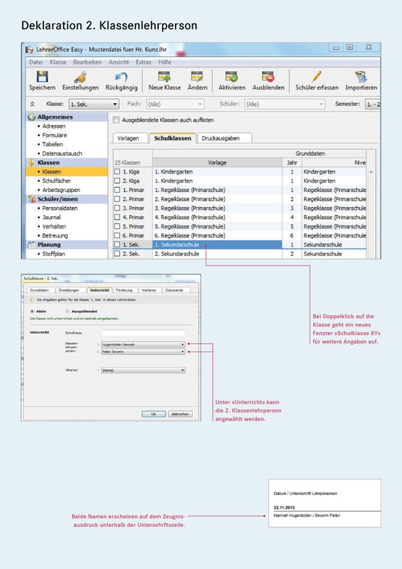 Werden in LehrerOffice beide Lehrpersonen als Klassenlehrpersonen deklariert, werden auch beide Namen auf dem Zeugnisformular aufgeführt. In der Folge haben beide das Zeugnisformular zu unterzeichnen. Die technische Anleitung ist im Wiki von LehrerOffice zu finden.