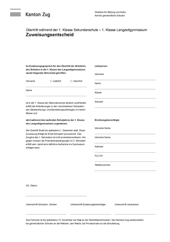 Der Zuweisungsentscheid muss von der Klassenlehrperson und den Erziehungsberechtigten bis spätestens 10. November gefällt werden. Das vollständig ausgefüllte und unterzeichnete Formular «Zuweisungsentscheid» wird von der Klassenlehrperson dem gemeindlichen Rektorat zugestellt und anschliessend der Übertrittskommission I des Kantons Zug weitergeleitet. Die Schulleitung der Gemeinde ist vorgängig über den Übertritt zu informieren.