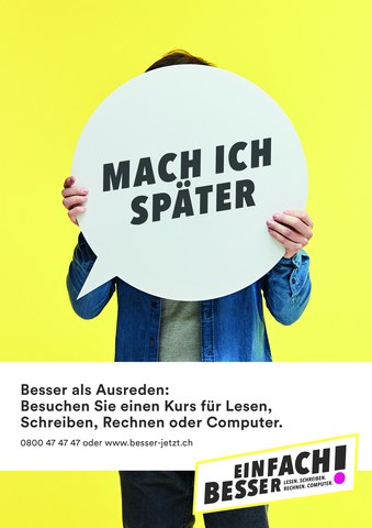 Die Kampagne «Einfach besser!» ist die erste schweizweite Initiative, welche die Öffentlichkeit für die Thematik der Grundkompetenzen sensibilisiert. Die Kampagne hat zum Ziel, Betroffene zu motivieren, sich in Zeiten stetig steigender Anforderungen im Bereich Lesen, Schreiben, Rechnen und digitalen Kompetenzen weiterzubilden.