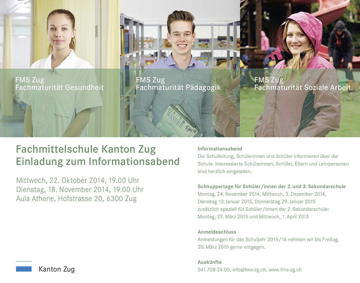 In den Pflegeberuf einsteigen? Lehrer werden? In einer Kinderkrippe arbeiten? Interessierte Schülerinnen, Schüler, Eltern und Lehrpersonen sind herzlich eingeladen, an unserem Informationsabend Näheres über die FMS Zug und den Einstieg in die Gesundheitsberufe, Lehrerberufe, Sozialberufe zu erfahren.Wann: Mittwoch, 22. Oktober 2014 und am Dienstag, 18. November 2014 Wo: Aula Athene, Hofstrasse 20, 6300 Zug