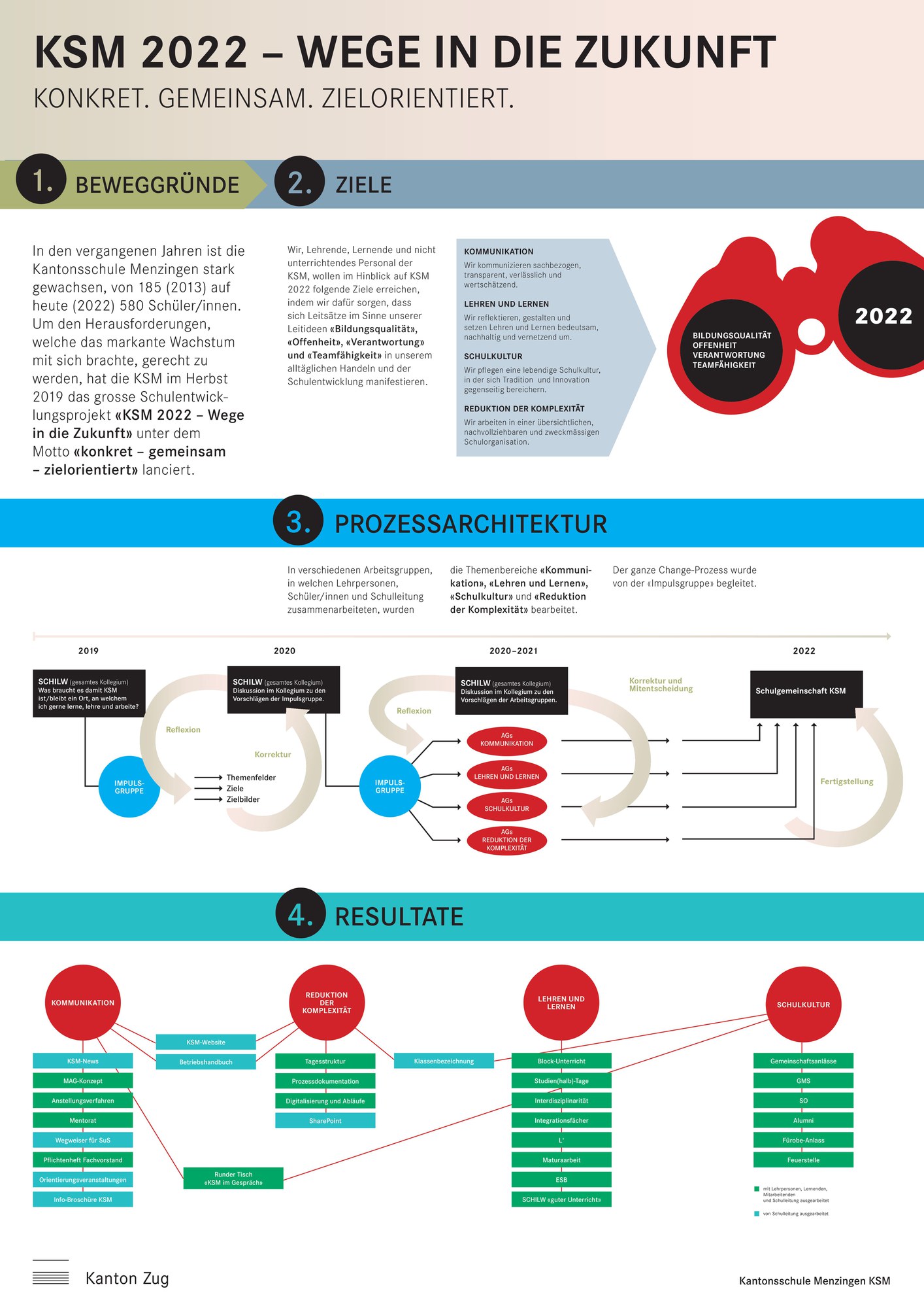 «KSM 2022 – Wege in die Zukunft» stellt einen kooperativen und kollektiven Lernprozess dar. In verschiedenen Arbeitsgruppen haben 35 Lehrpersonen, 14 Schüler/innen und die Schulleitung gemeinsam über die Vergangenheit, die Gegenwart und die Zukunft der KSM nachgedacht und sich Gedanken über das pädagogische Wirken gemacht. In den zu Beginn des Projektes bestimmten vier Themenbereichen «Kommunikation», «Lehren und Lernen», «Schulkultur» und «Reduktion der Komplexität» wurden die vom ganzen Kollegium ausgearbeitete Ziele konsequent verfolgt: Datenbasiert (aufgrund von an der Schule erhobenen Daten und den Resultaten aus der Forschung) und sorgfältig wurde dabei hinterfragt, wo sich Bestehendes bewährt hat, wo die Prozesse sowie Abläufe optimiert werden müssen und wo Neues angesagt ist.