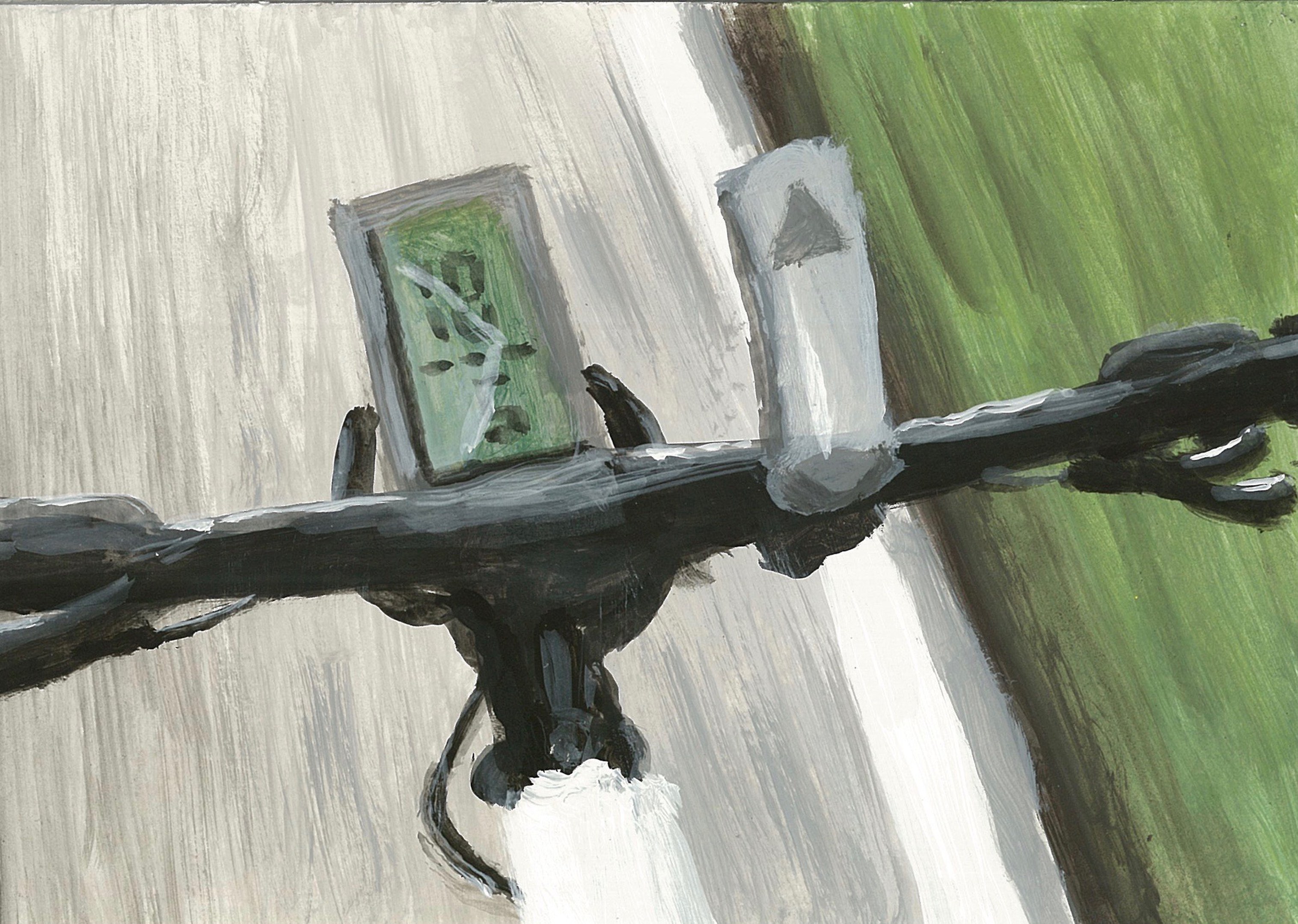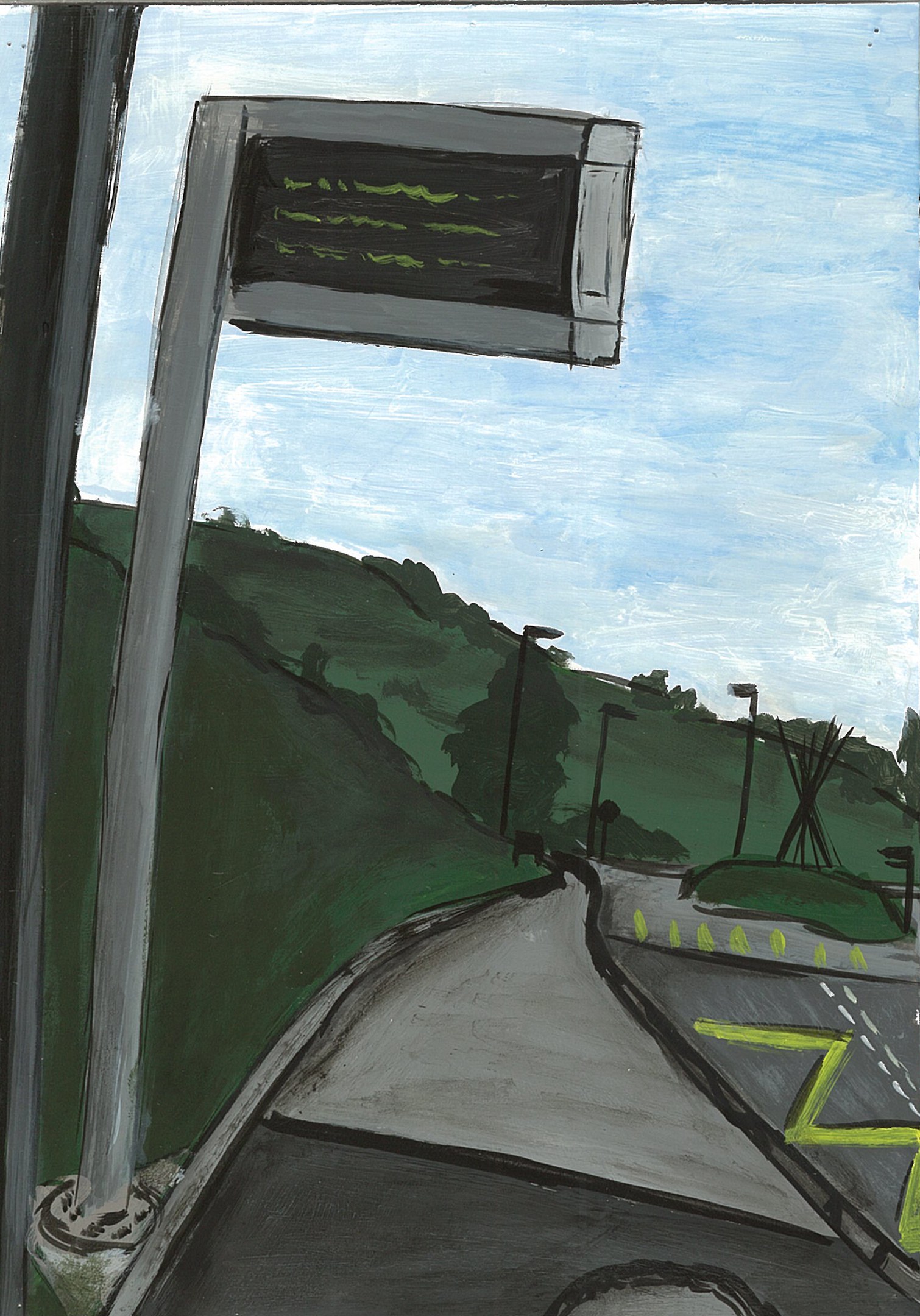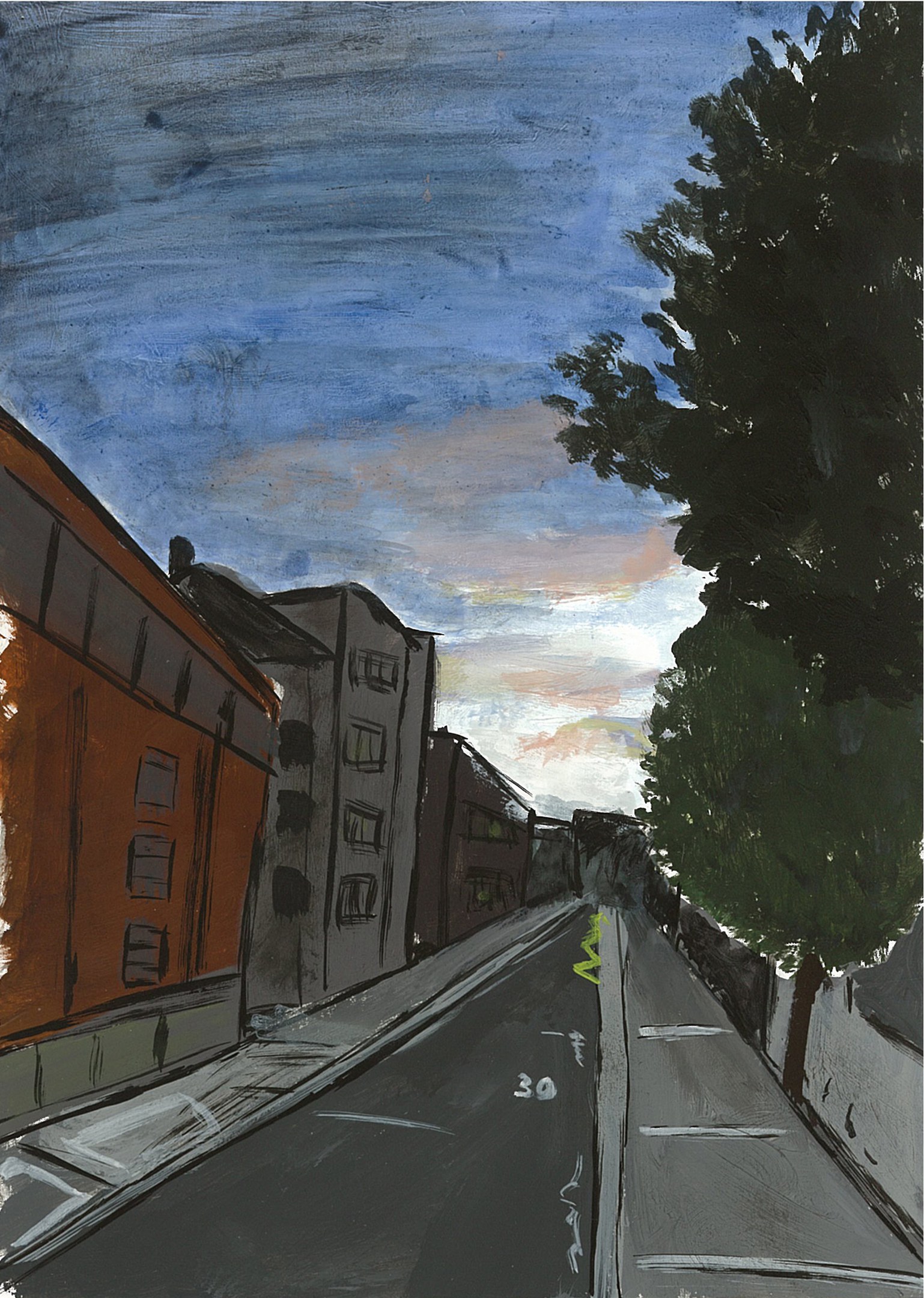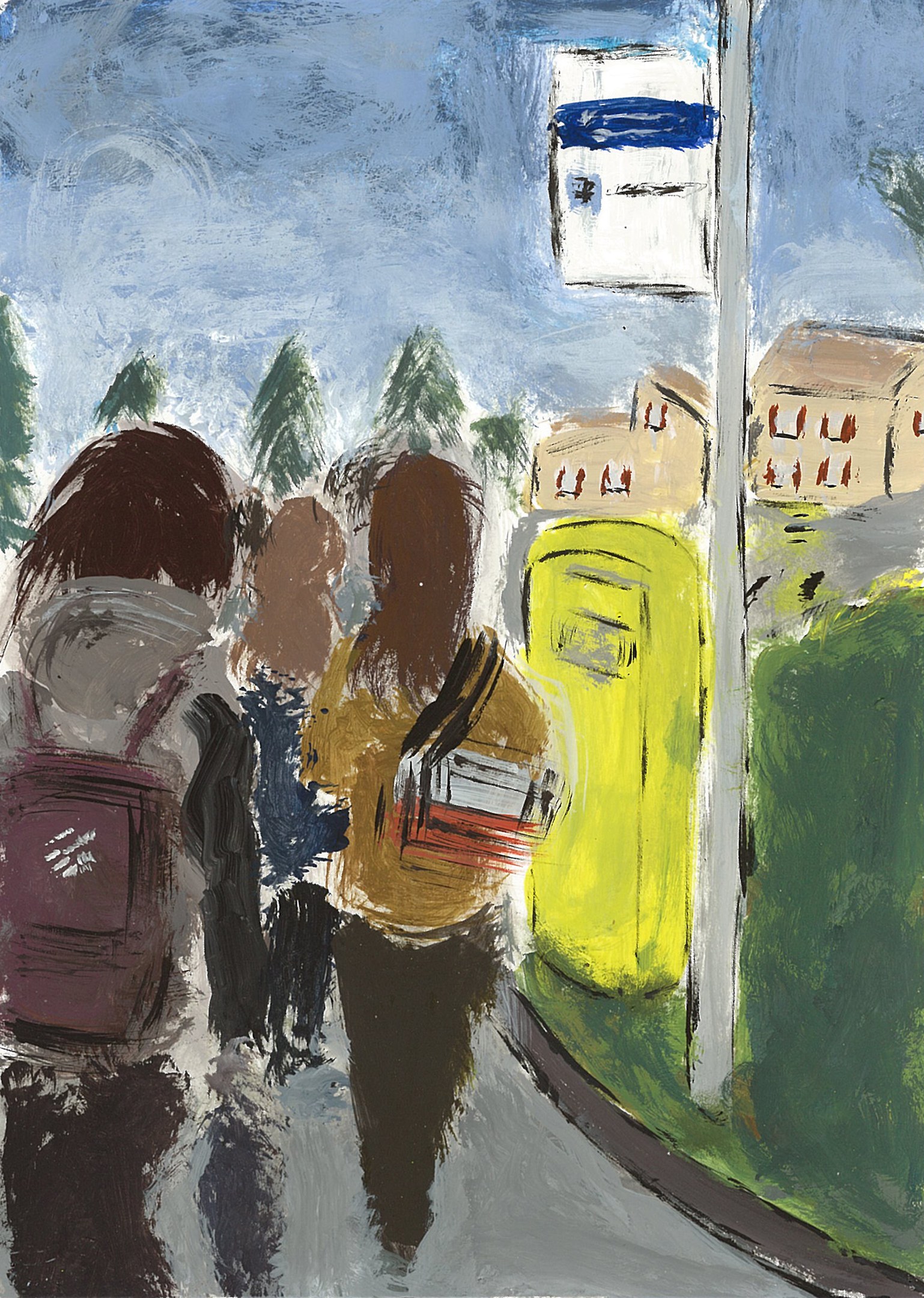 Ebenfalls von der Klasse 4cz stammen die längeren Serien über den Schulweg. Zum Thema «Zeitgenössische Malerei» (inspiriert von Jean Fréderik Schnyder) fotografierten die Maturandinnen und Maturanden mit dem Handy mehr oder weniger zufällig ihren Schulweg – auch aus ungewohnter Perspektive – und gewannen so einen frischen Blick aufs Gewohnte und typisch Schweizerische ihrer Umgebung. Direkt vom Handybildschirm malten sie darauf eine Serie von drei bis fünf Bildern im A5 Format.