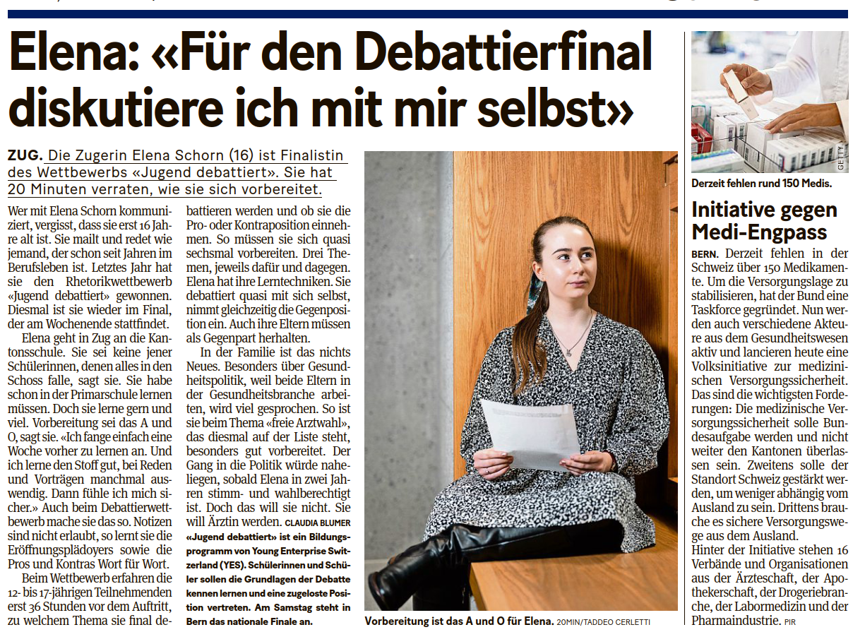 03.04.2023Elena: «Für den Debattierfinal diskutiere ich mit mir selbst»Die Zugerin Elena Schorn (16) ist Finalistin des Wettbewerbs «Jugend debattiert». Sie hat 20 Minuten verraten, wie sie sich vorbereitet.https://publisher-zgch-test.webcloud7.ch/izug/platform/behoerden/direktion-fur-bildung-und-kultur/ksz/dokumente/medienspiegel/elena-fuer-den-debattierfinal-diskutiere-ich-mit-mir-selbsthttps://publisher-zgch-test.webcloud7.ch/izug/platform/logo.png