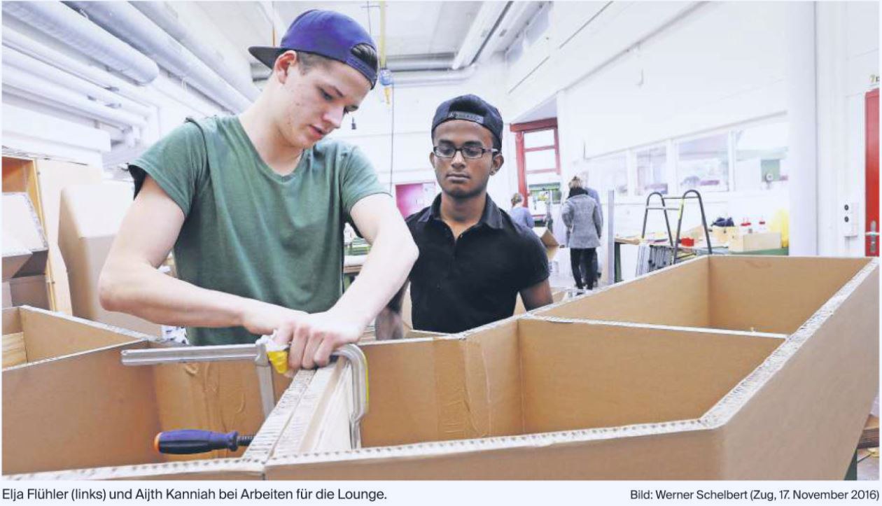 Dann machen sich die Schüler an diesem Donnerstagnachmittag wieder hoch konzentriert an die Arbeit und setzen die Einzelteile zusammen. Sodass die Lounge auch sicher bis am kommenden Mittag fertig wird.