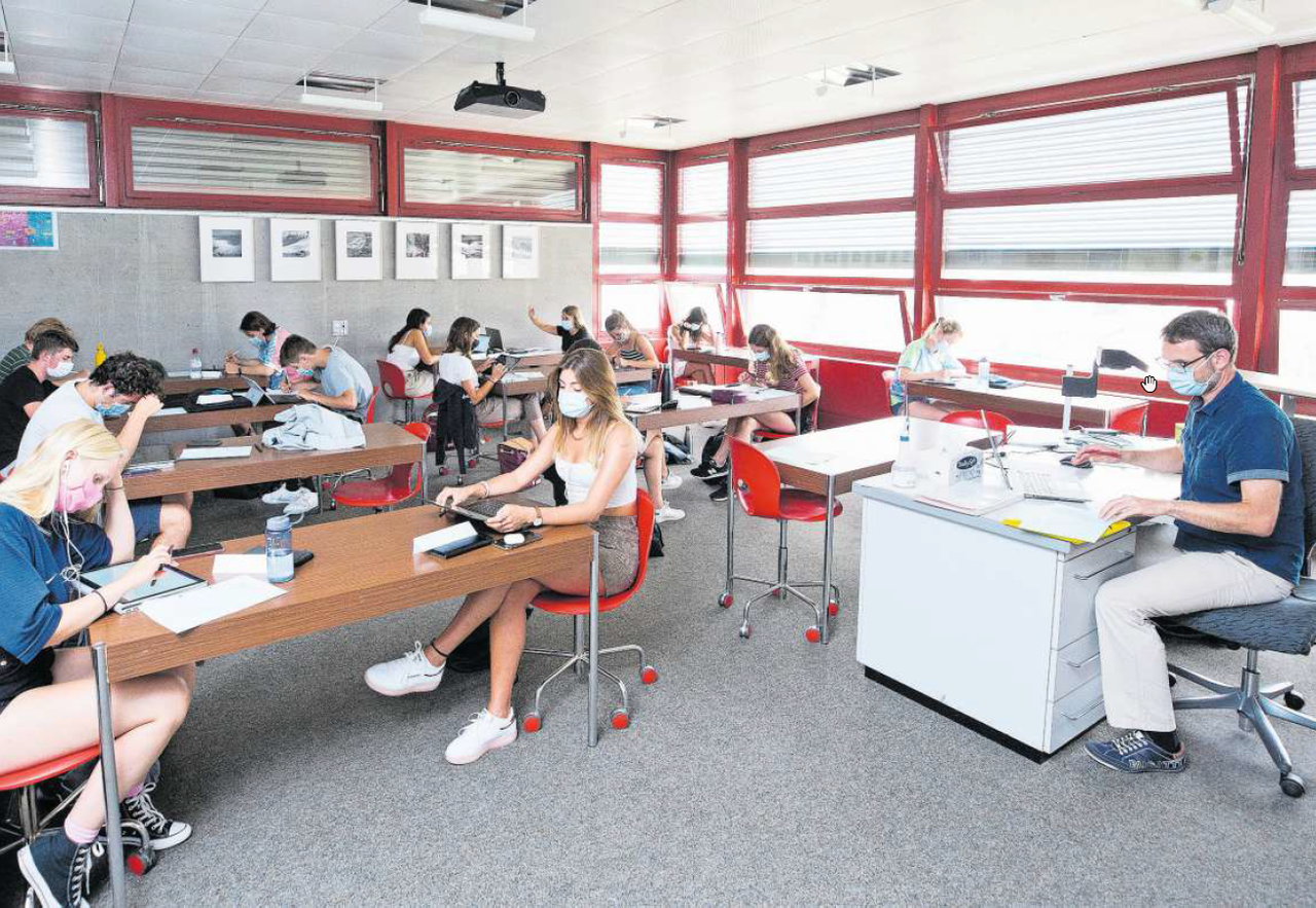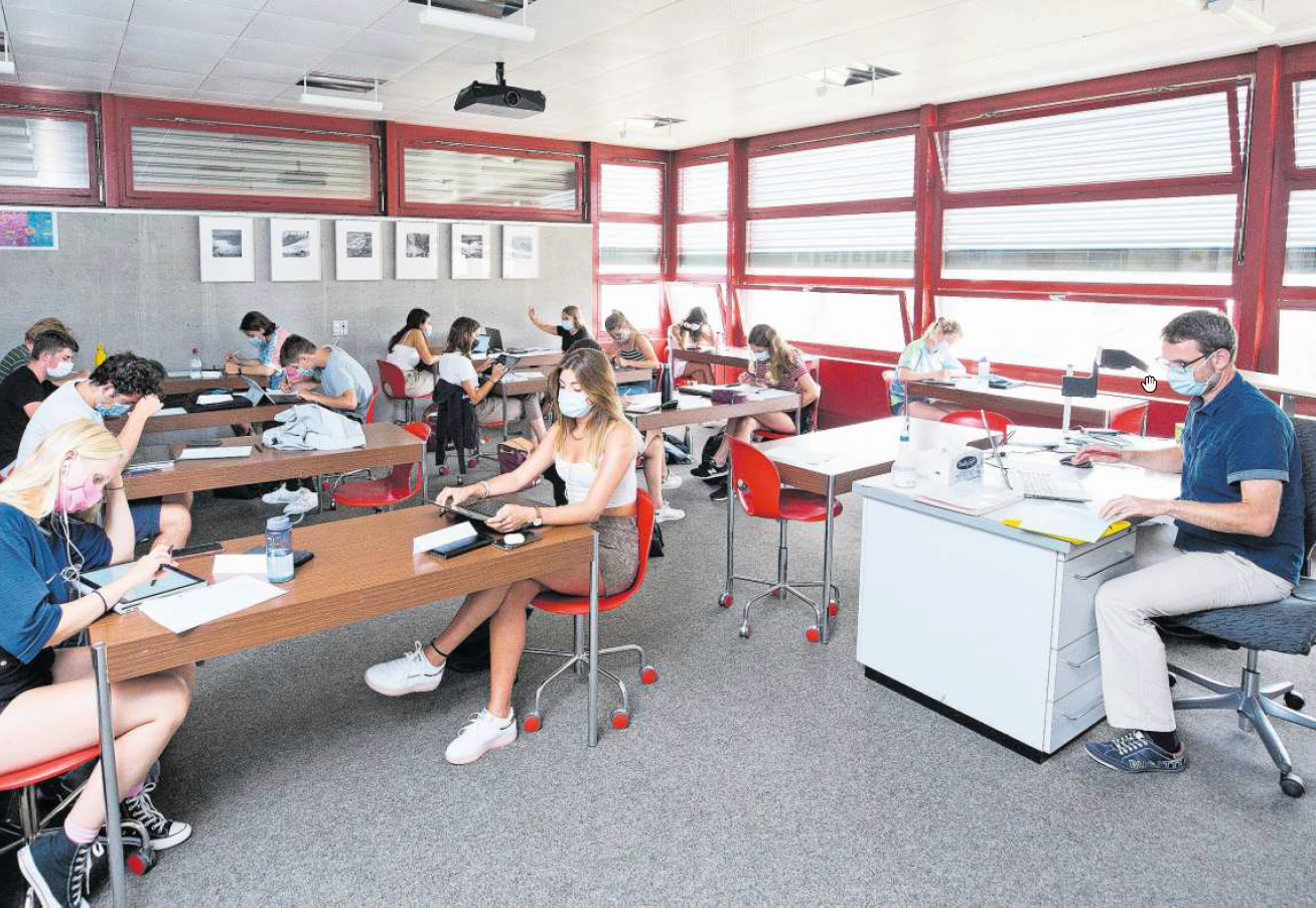 Seit Montag gilt an der Kantonsschule Zug eine Maskenpflicht. Im Gegensatz zur Kantonsschule Menzingen müssen die Masken immer getragen werden – auch bei genügend Abstand im Schulzimmer. Das stösst nicht überall auf Begeisterung, wie ein Besuch im Ergänzungsfach «Anwendungen der Mathematik» zeigt (siehe Boxen). Die Klasse hat am späten Mittwochnachmittag im obersten Stock des Altbaus Schule – dort, wo es im Sommer meistens ziemlich warm wird. Heute sind die Temperaturen erträglich, die Türen offen und die Storen unten.