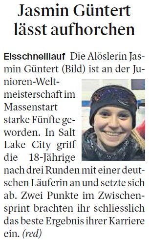 Alosen/Oberägeri Beim Rennen auf dem wohl schnellsten Eis der Welt, bei der Junioren WM in Salt Lake City, griff Jasmin Güntert nach drei von zehn Runden zusammen mit der Deutschen Lea-Sophie Scholz an. Relativ schnell konnten die beiden eine Lücke aufreissen und sich etwas vom Feld absetzen. Beim Zwischensprint nach fünf Runden konnte sich Güntert dann hinter Lea-Sophie Scholz zwei Punkte einfahren, was in der  Endabrechnung mit dem 5. Rang belohnt wurde. Dies ist bis jetzt die beste Klassierung in der Eisschnelllauf-Karriere von Jasmin Güntert.