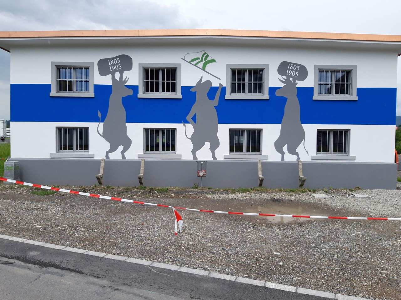 Mit seiner vormaligen Fassade hätte es den Besuchern einen wenig festlichen Empfang bereitet. Nun sei die Fassade nicht einfach renoviert, sondern im Hinblick auf das Schwingfest künstlerisch gestaltet worden. Initiiert hat das Projekt Hans Peter Gnos, Alt-Rektor der Kantonsschule Zug. Vonseiten der Kantonsschule kam der Entwurf, die konkrete Umsetzung übernahmen Zuger Lehrlinge.