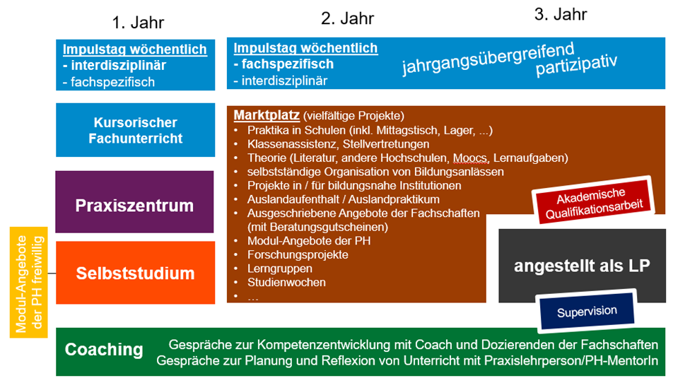 - beinhaltet vielfältige Zeitstrukturen: Doppellektionen, Halbtage, Tage und Studienwochen.