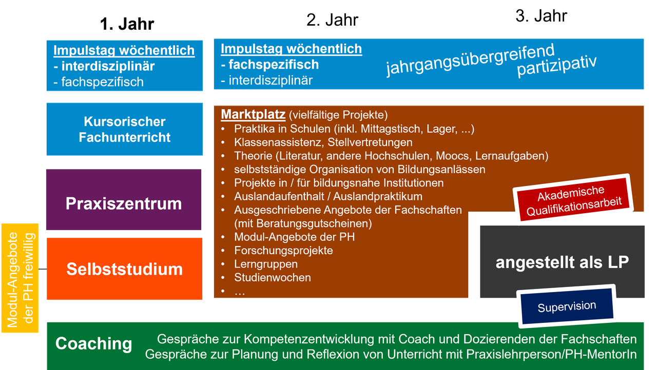 An einem weiteren Tag erarbeiten sich die Studierenden die Grundkompetenzen des Unterrichtens in einem Praxiszentrum, d.h. sie lernen und arbeiten einen ganzen Tag zusammen mit Mitstudierenden, Praxislehrpersonen und Schülerinnen und Schülern an einer Schule. Dabei werden sie von einer Mentoratsperson der PH begleitet, deren Aufgabe primär darin besteht, für eine möglichst optimale Verknüpfung von Theorie und Praxis zu sorgen.