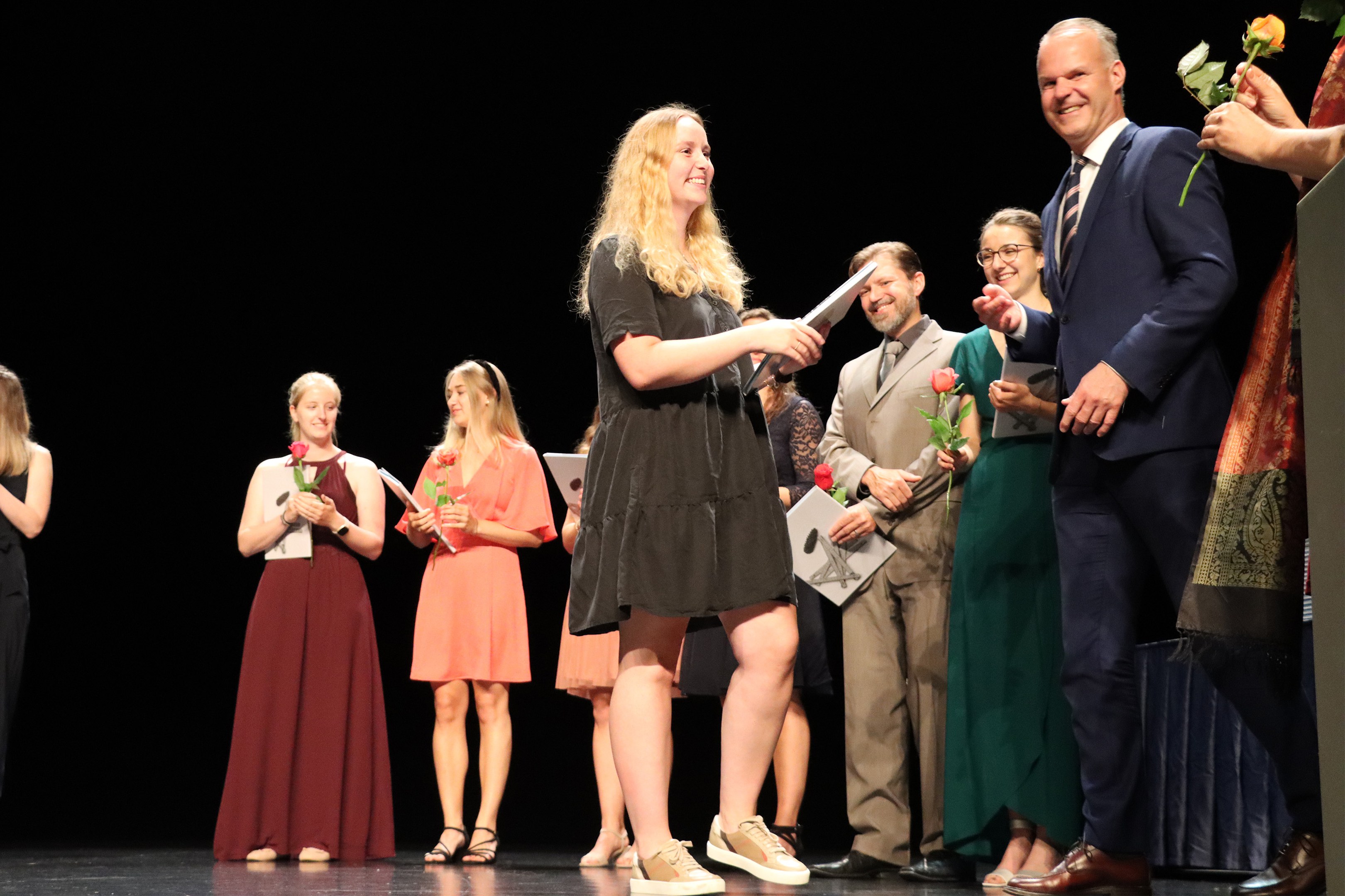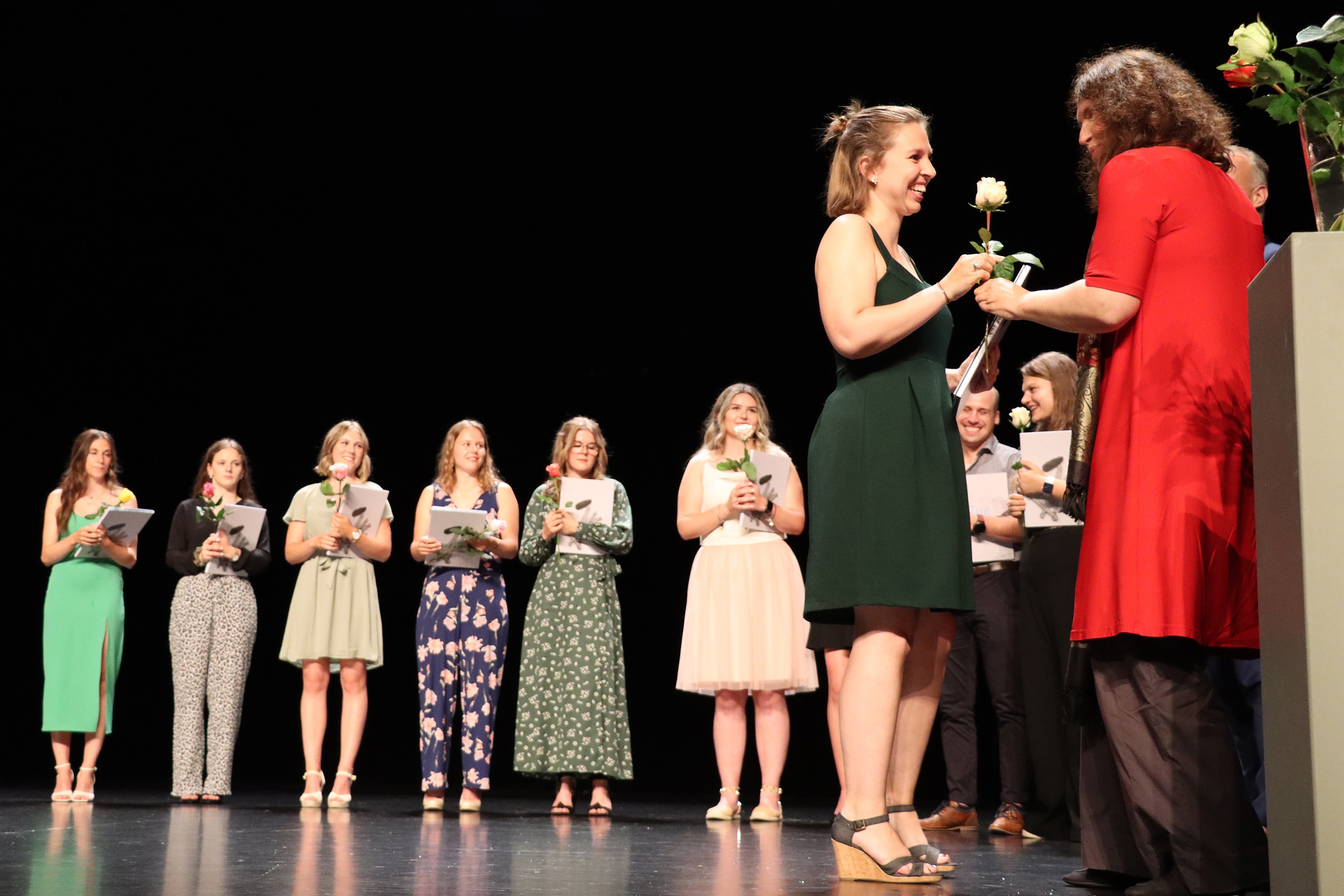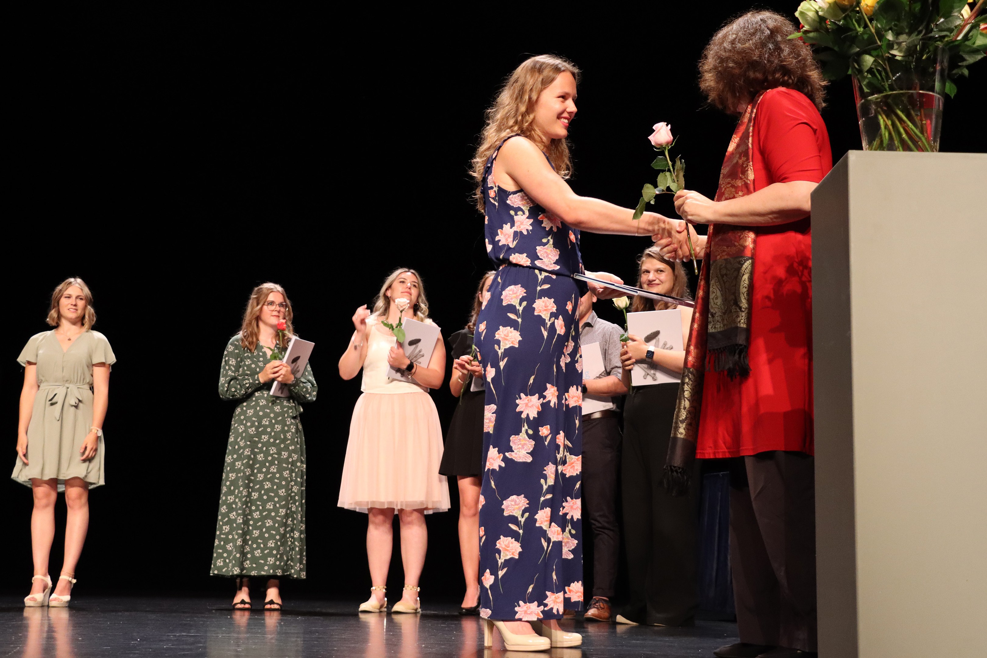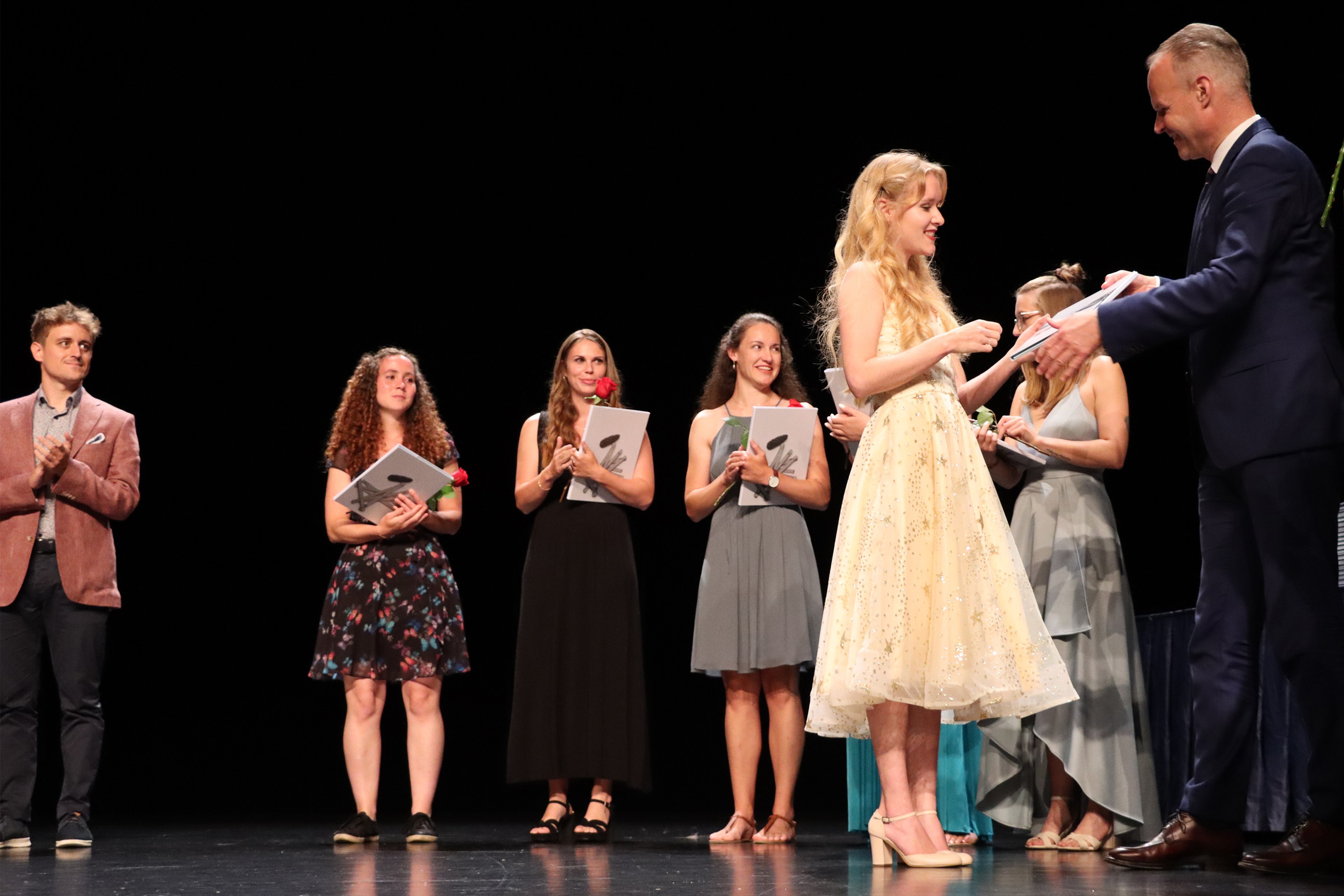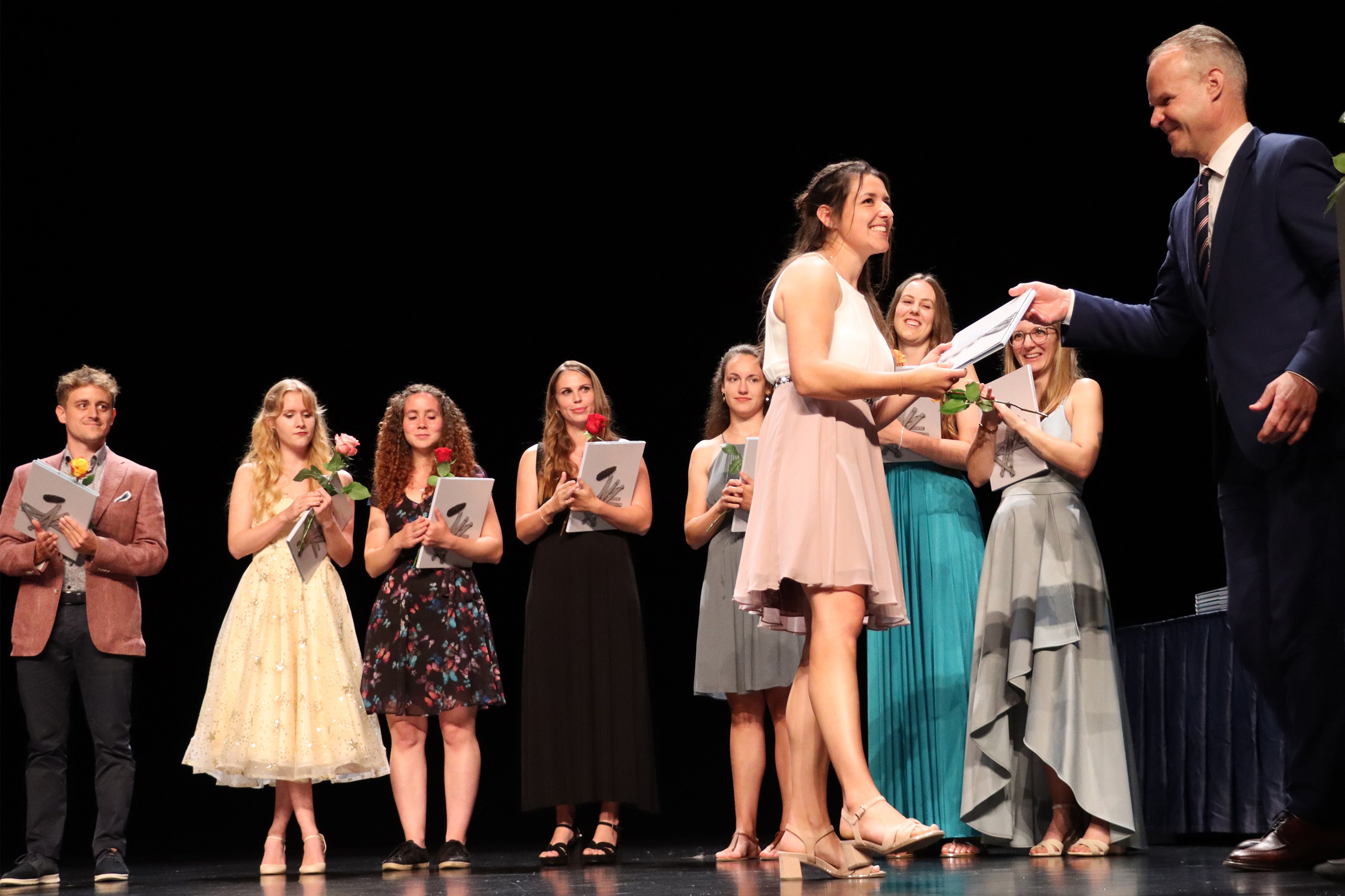 Moderiert wurde die Diplomfeier im Theater Casino Zug von Clemens Diesbergen, Prorektor und Leiter Ausbildung der PH Zug. Er führte durchs Programm und verdankte die Beiträge. Ein besonderer Dank kam der Studentin Elsa Nastase, die mit ihrer Geige und Klavierbegleitung den Auftakt wie auch den Abschluss der Feier gestaltete sowie den Studierenden des Abschlussjahrgangs mit der Vertiefung Musik, die die Feier mit Auszügen aus ihrem energiegeladenen Musical-Projekt bereicherten, zu. In ihrem Schlusswort wünscht auch die Rektorin Esther Kamm den Studierenden alles Gute für ihren beruflichen Weg und bedankte sich für deren Engagement im Studium.