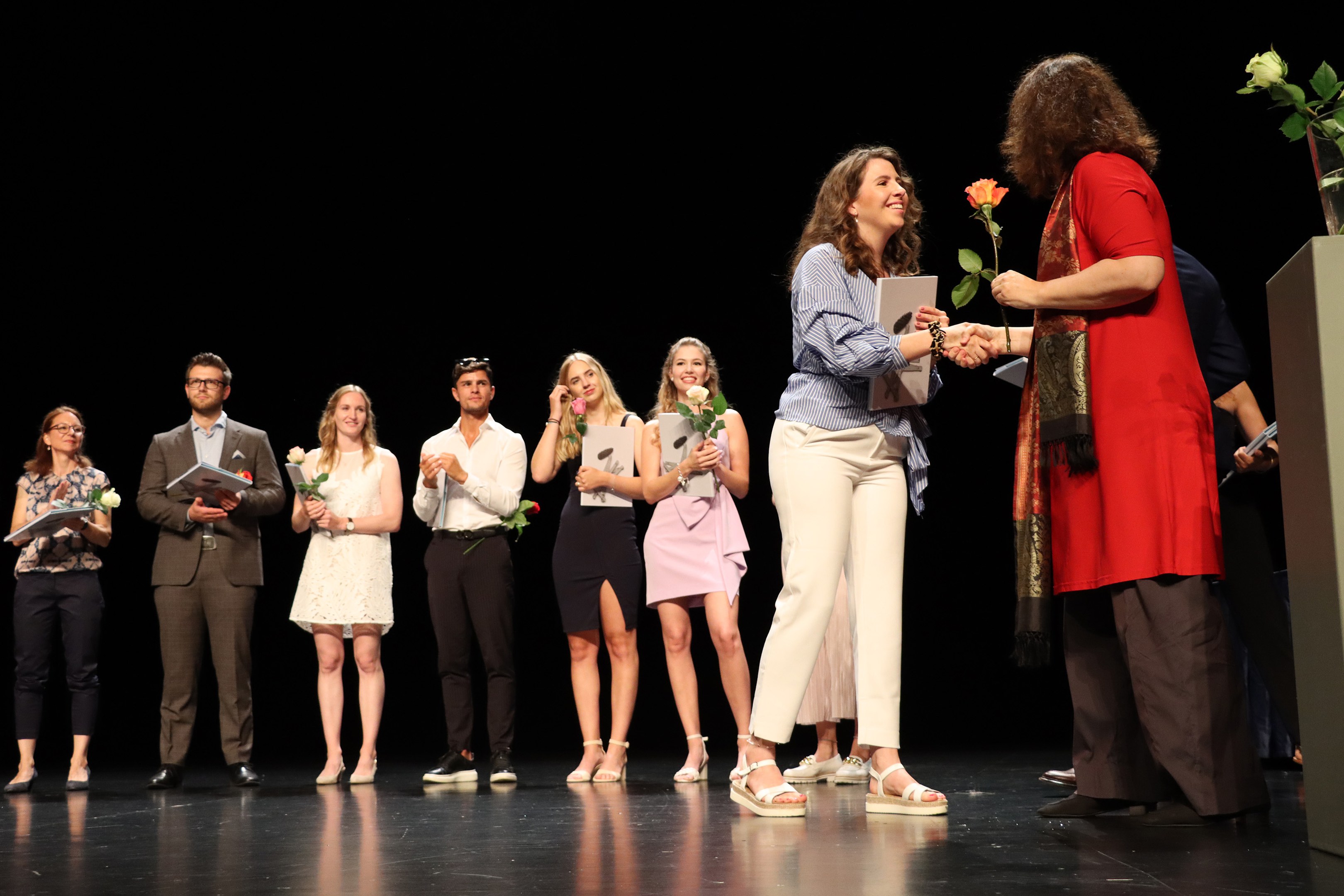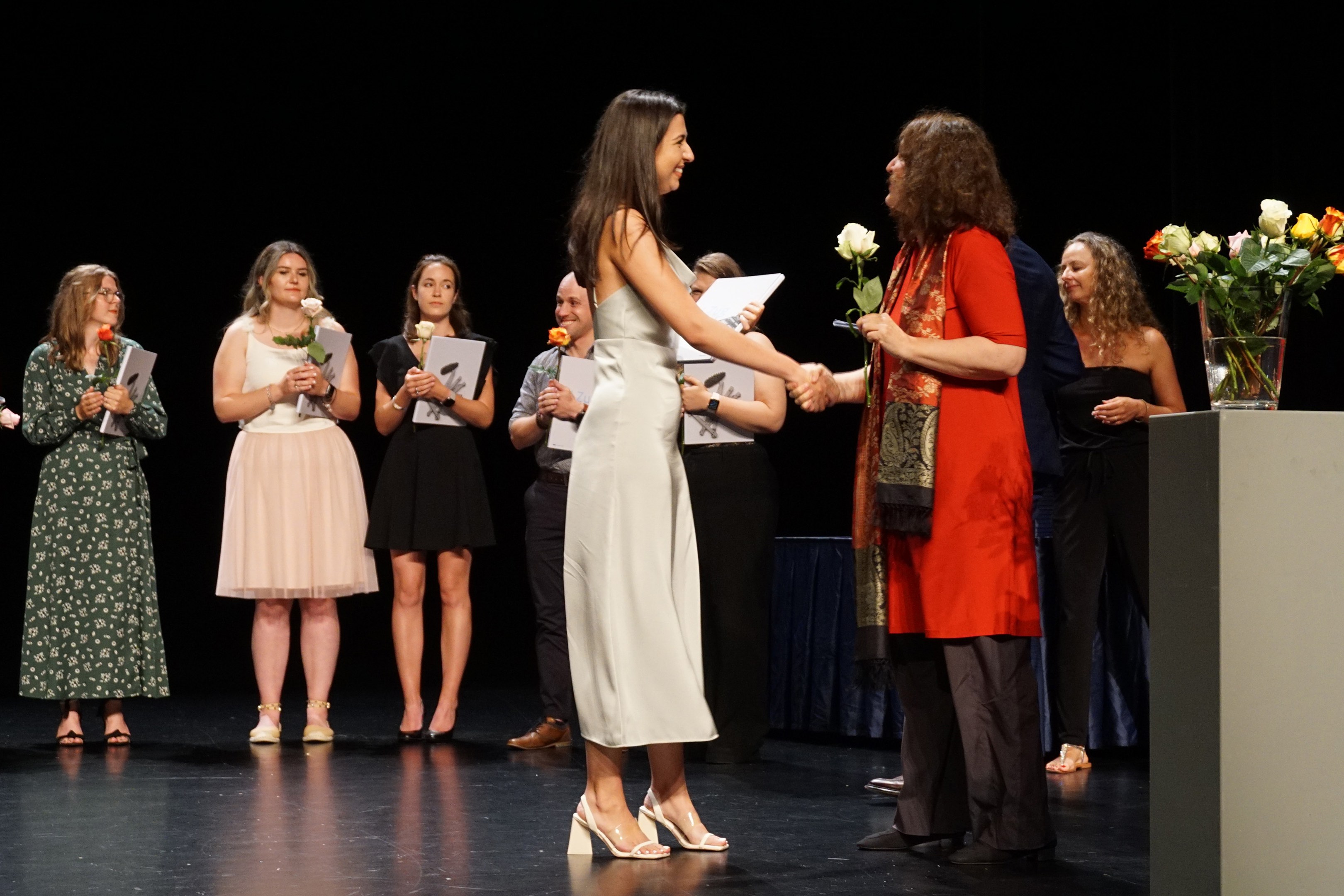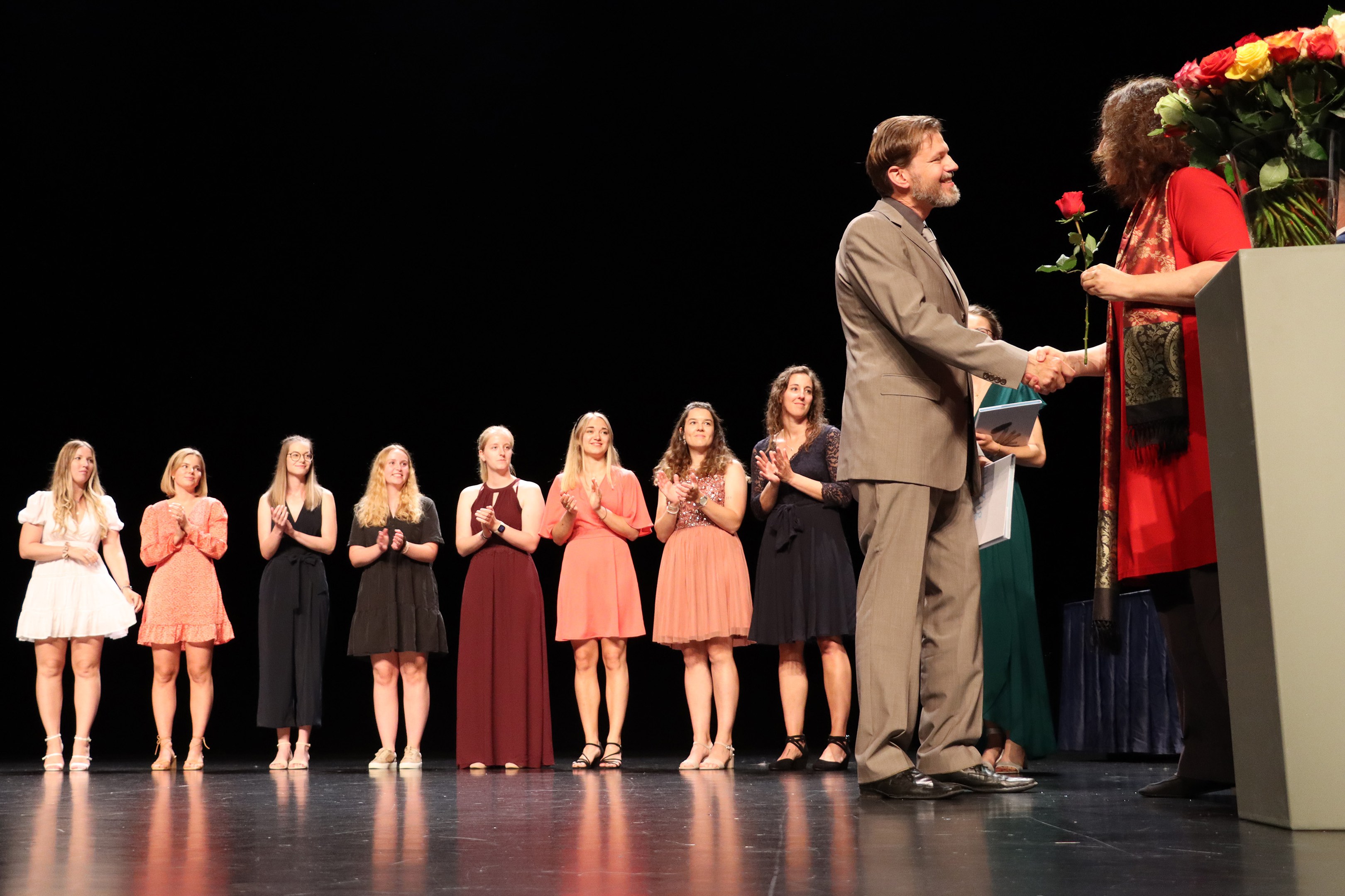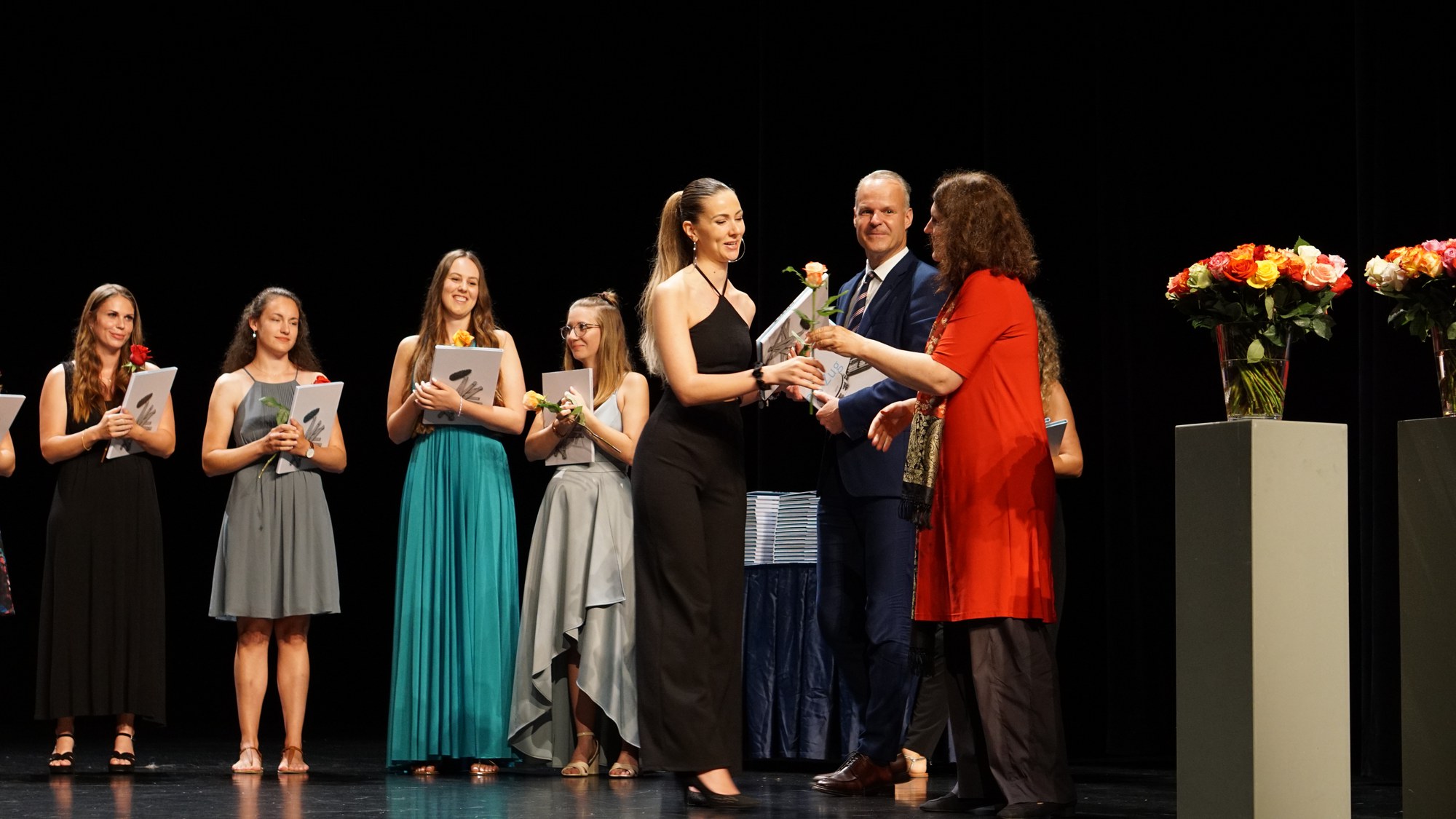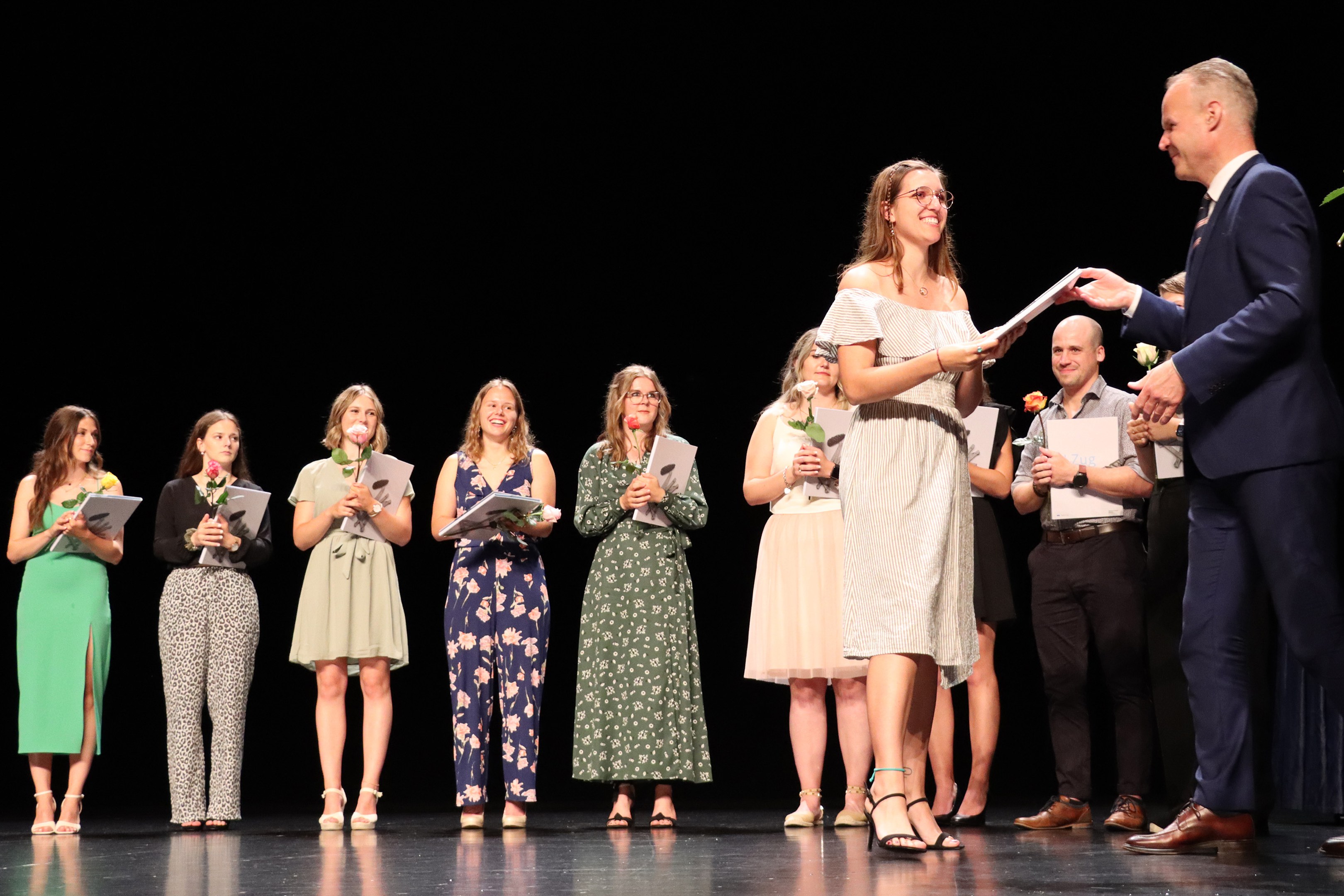 Moderiert wurde die Diplomfeier im Theater Casino Zug von Clemens Diesbergen, Prorektor und Leiter Ausbildung der PH Zug. Er führte durchs Programm und verdankte die Beiträge. Ein besonderer Dank kam der Studentin Elsa Nastase, die mit ihrer Geige und Klavierbegleitung den Auftakt wie auch den Abschluss der Feier gestaltete sowie den Studierenden des Abschlussjahrgangs mit der Vertiefung Musik, die die Feier mit Auszügen aus ihrem energiegeladenen Musical-Projekt bereicherten, zu. In ihrem Schlusswort wünscht auch die Rektorin Esther Kamm den Studierenden alles Gute für ihren beruflichen Weg und bedankte sich für deren Engagement im Studium.