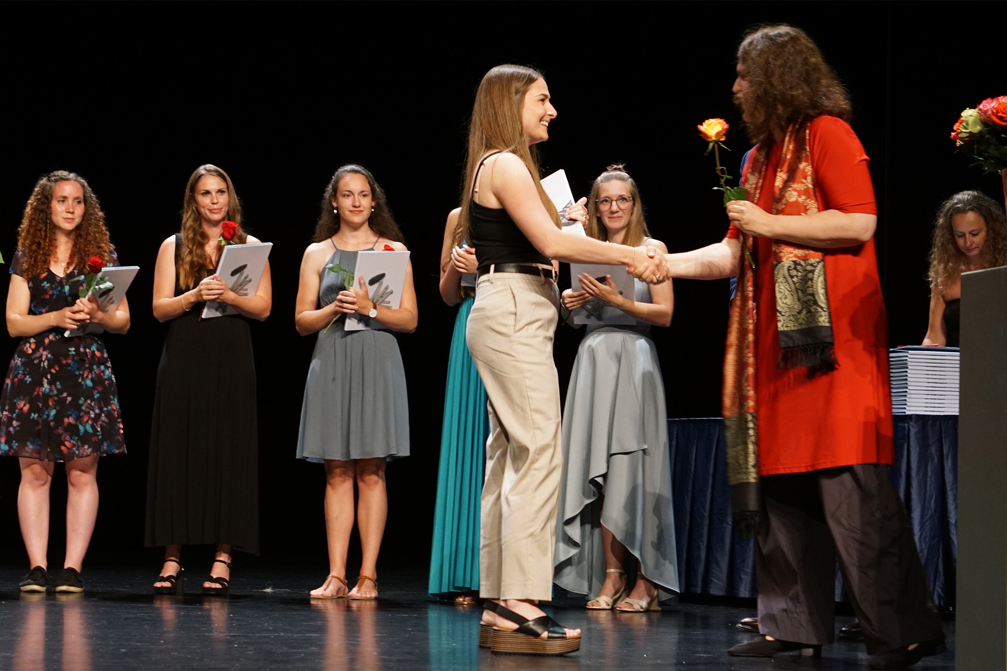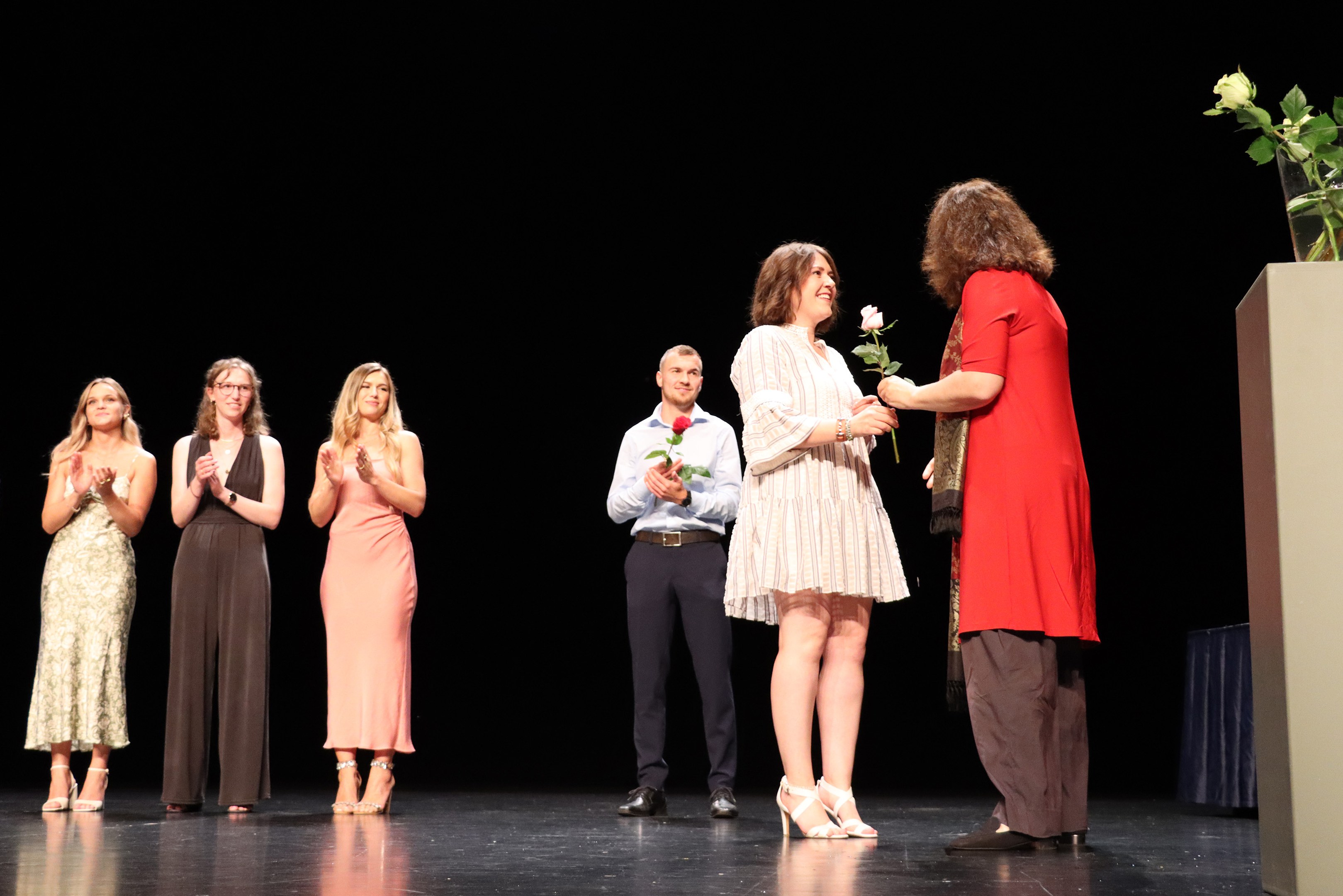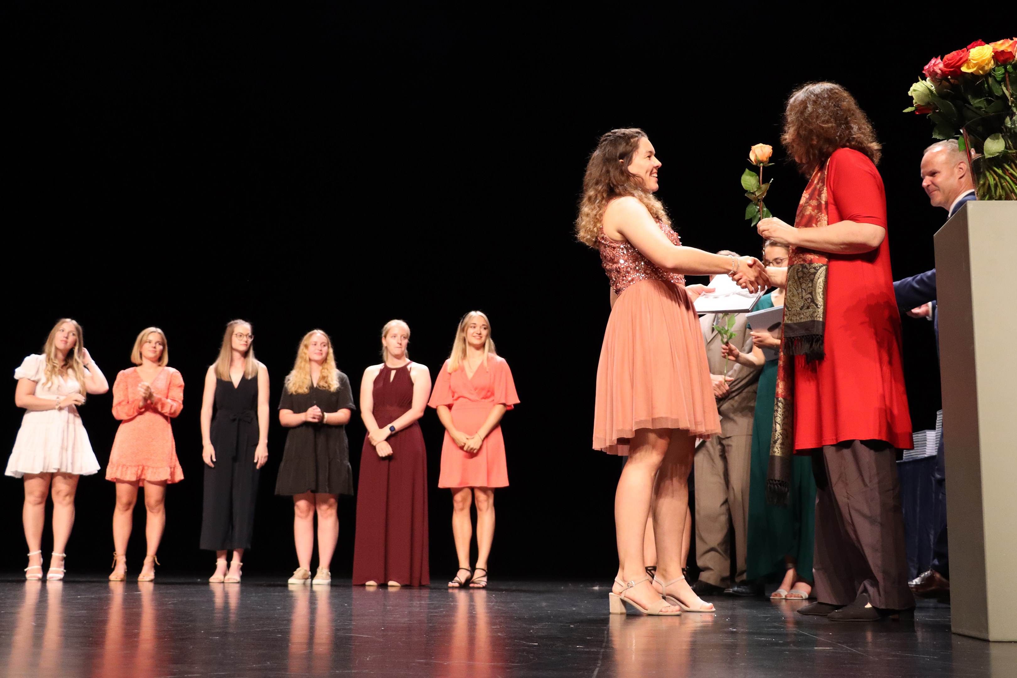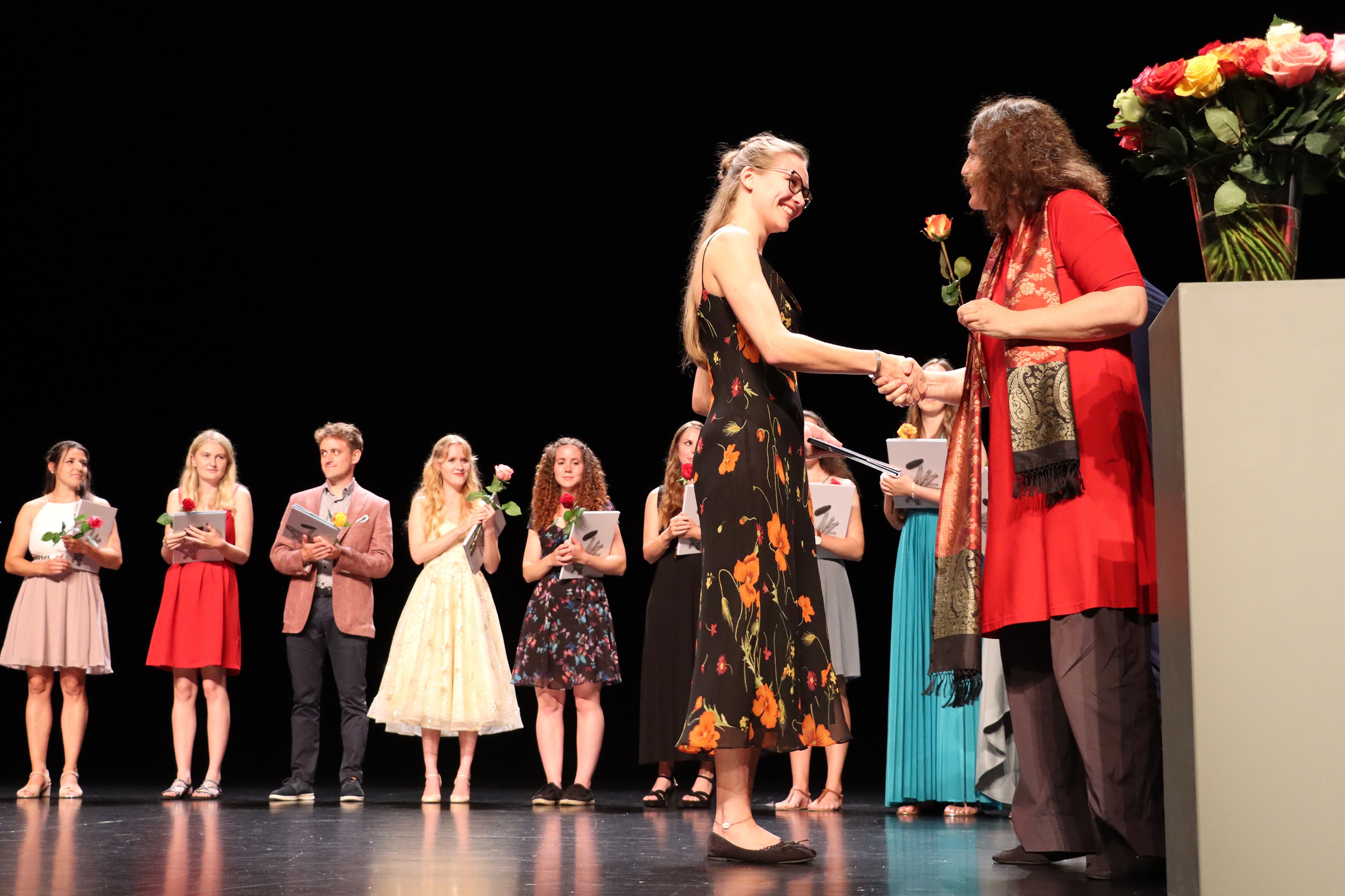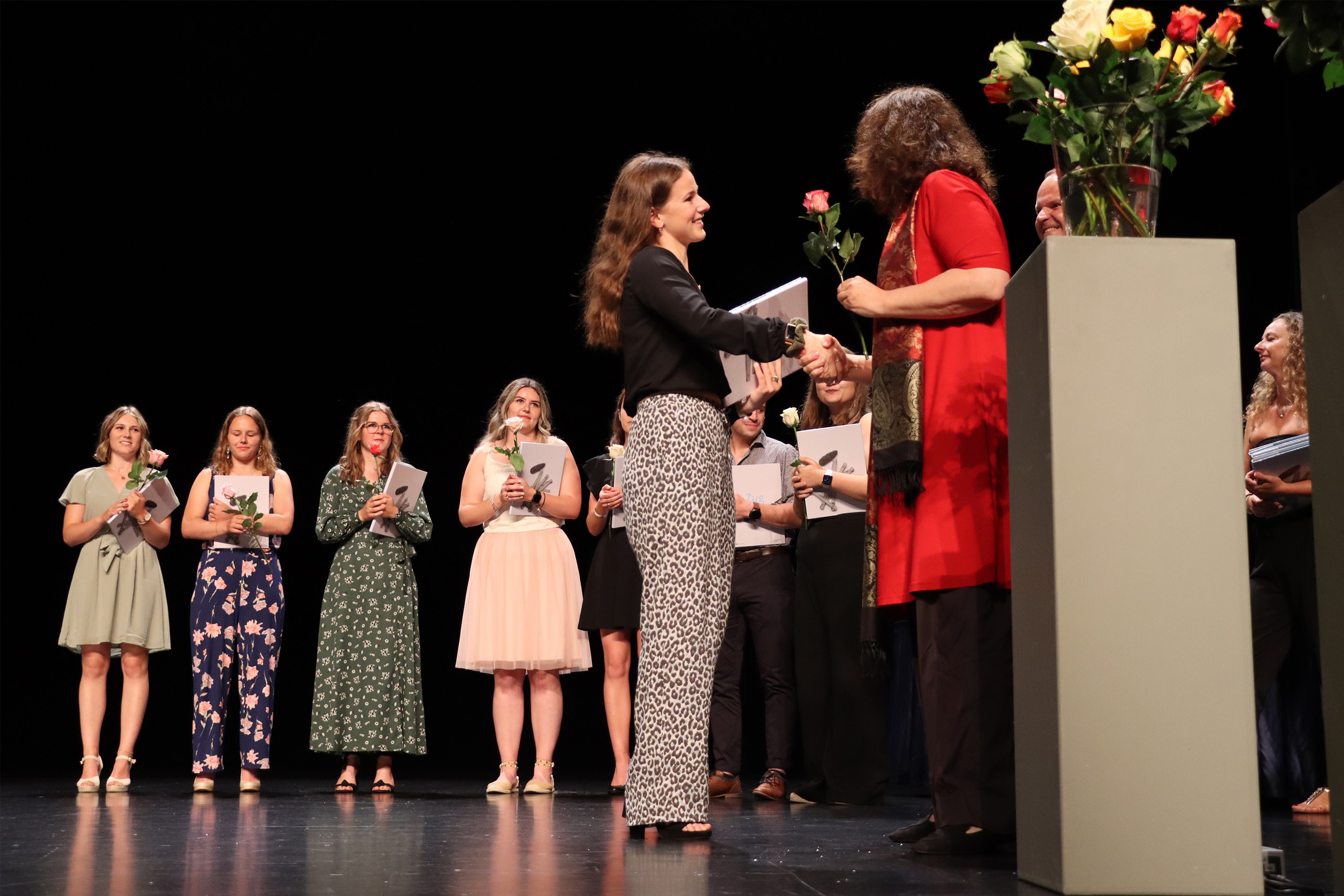 Moderiert wurde die Diplomfeier im Theater Casino Zug von Clemens Diesbergen, Prorektor und Leiter Ausbildung der PH Zug. Er führte durchs Programm und verdankte die Beiträge. Ein besonderer Dank kam der Studentin Elsa Nastase, die mit ihrer Geige und Klavierbegleitung den Auftakt wie auch den Abschluss der Feier gestaltete sowie den Studierenden des Abschlussjahrgangs mit der Vertiefung Musik, die die Feier mit Auszügen aus ihrem energiegeladenen Musical-Projekt bereicherten, zu. In ihrem Schlusswort wünscht auch die Rektorin Esther Kamm den Studierenden alles Gute für ihren beruflichen Weg und bedankte sich für deren Engagement im Studium.