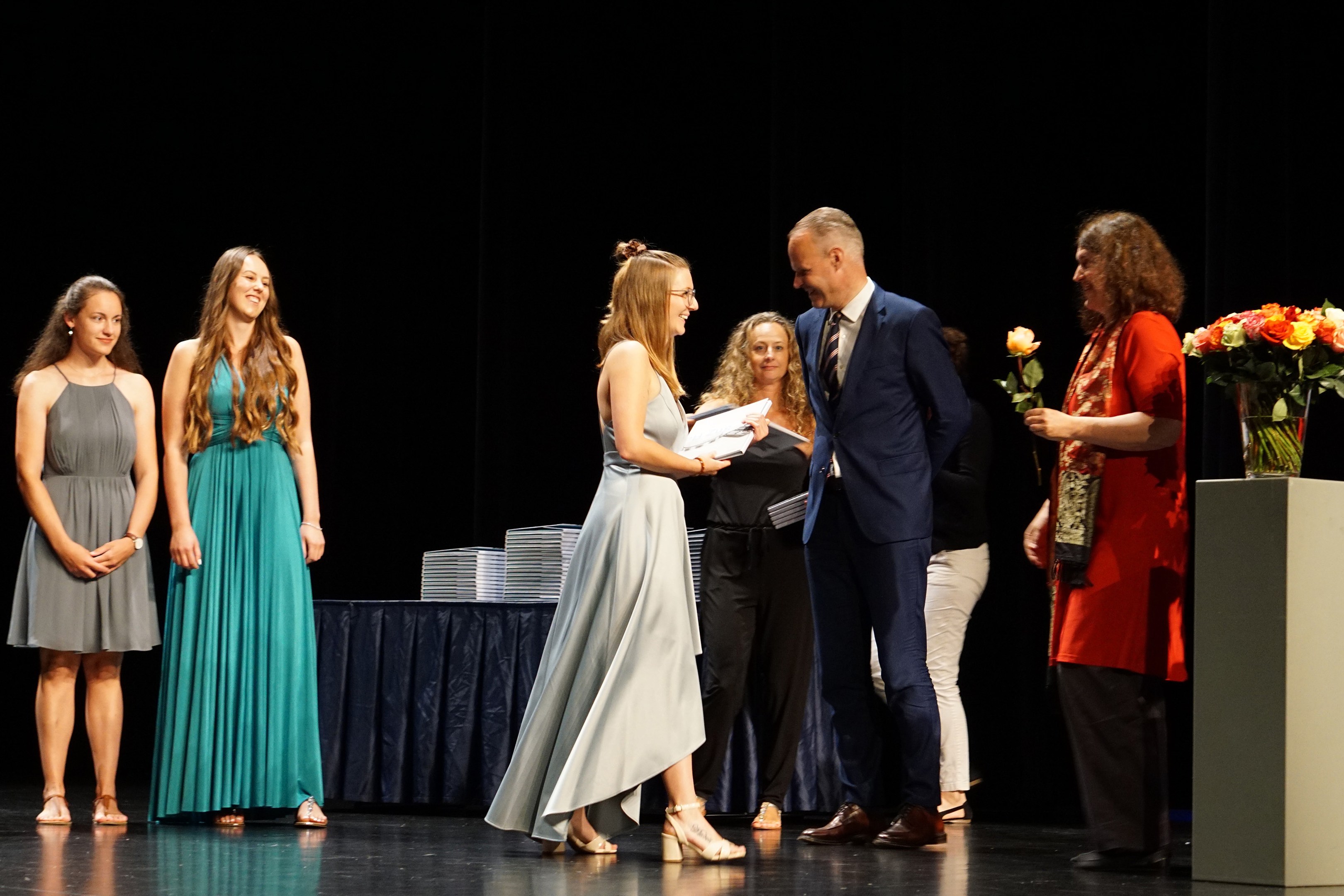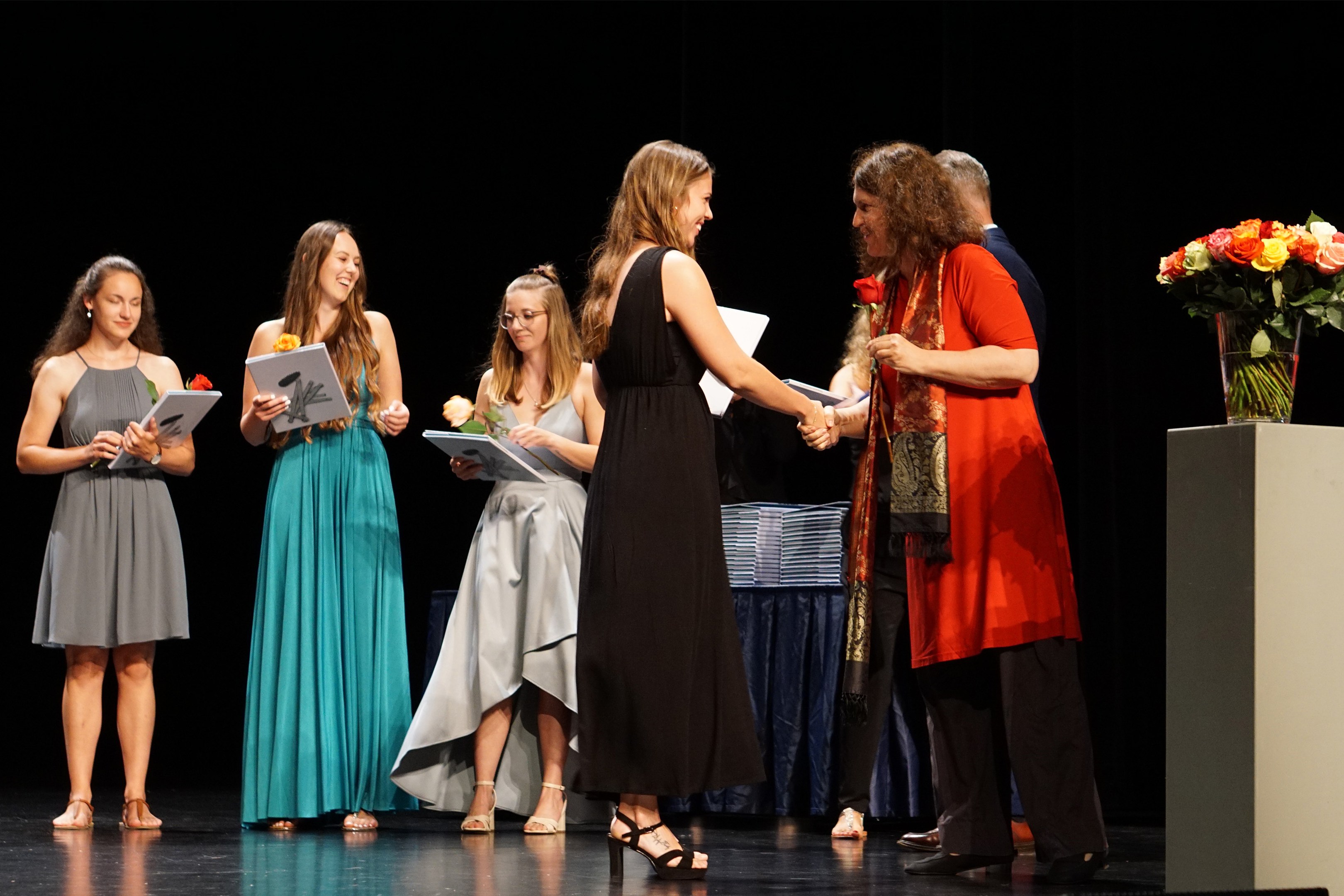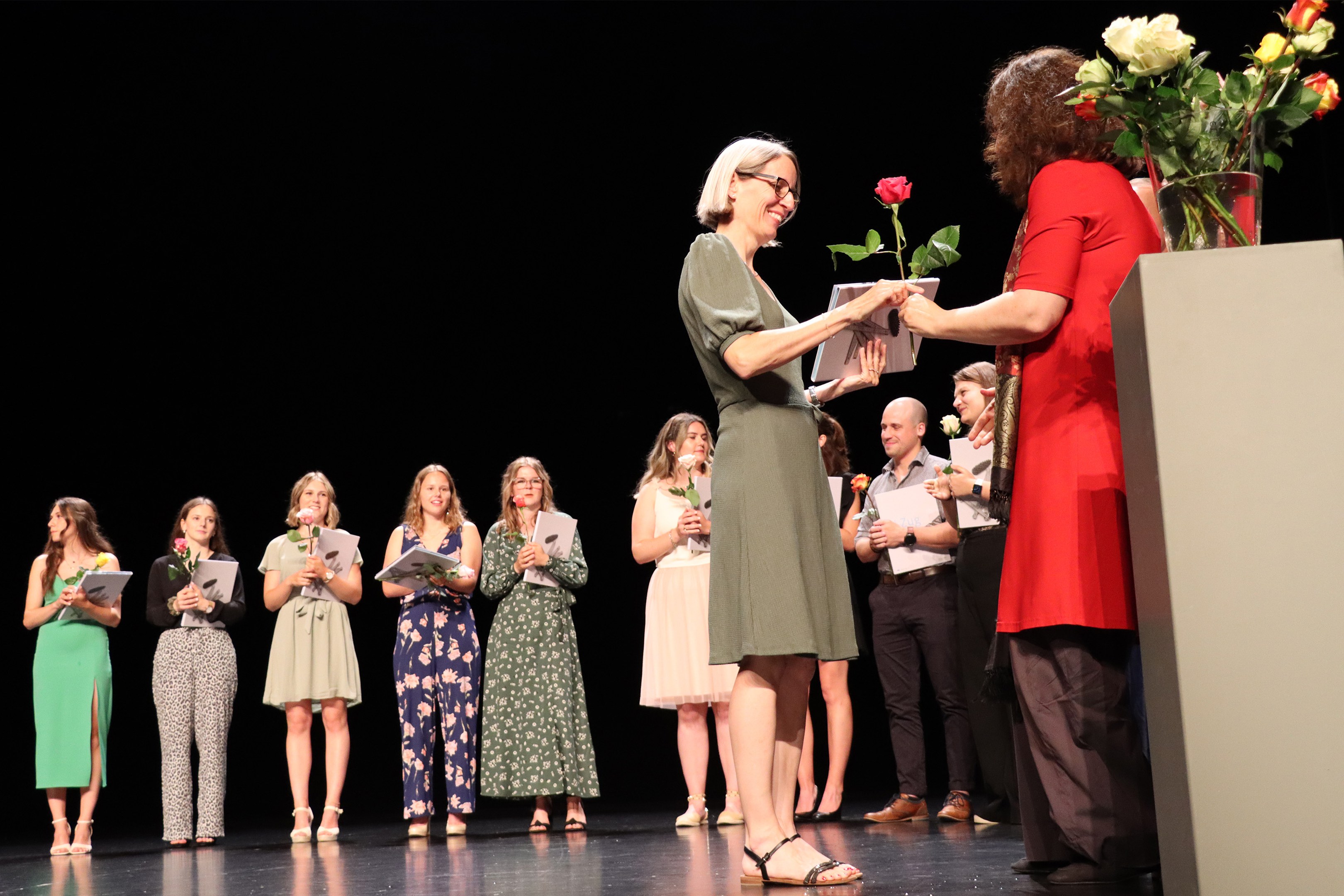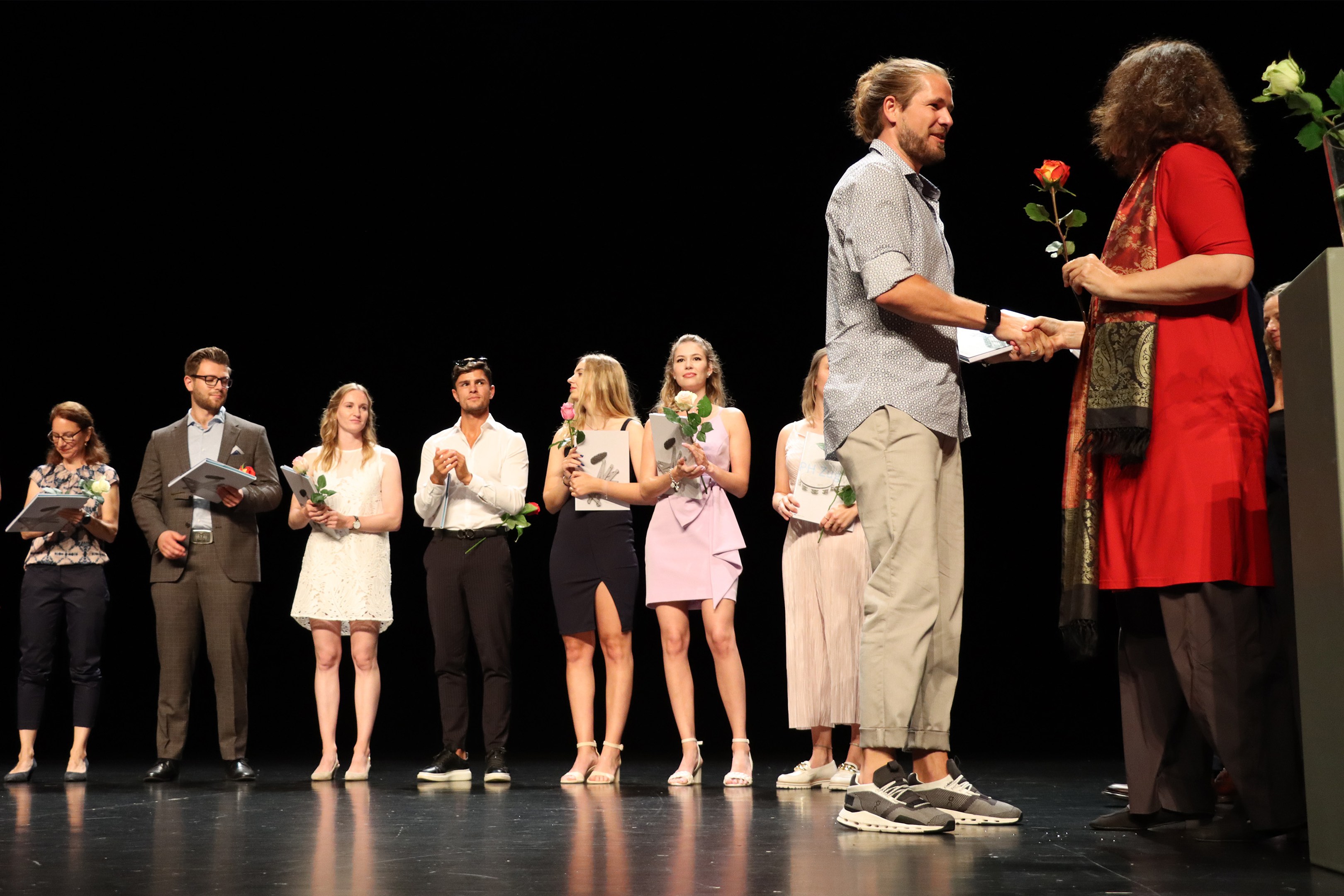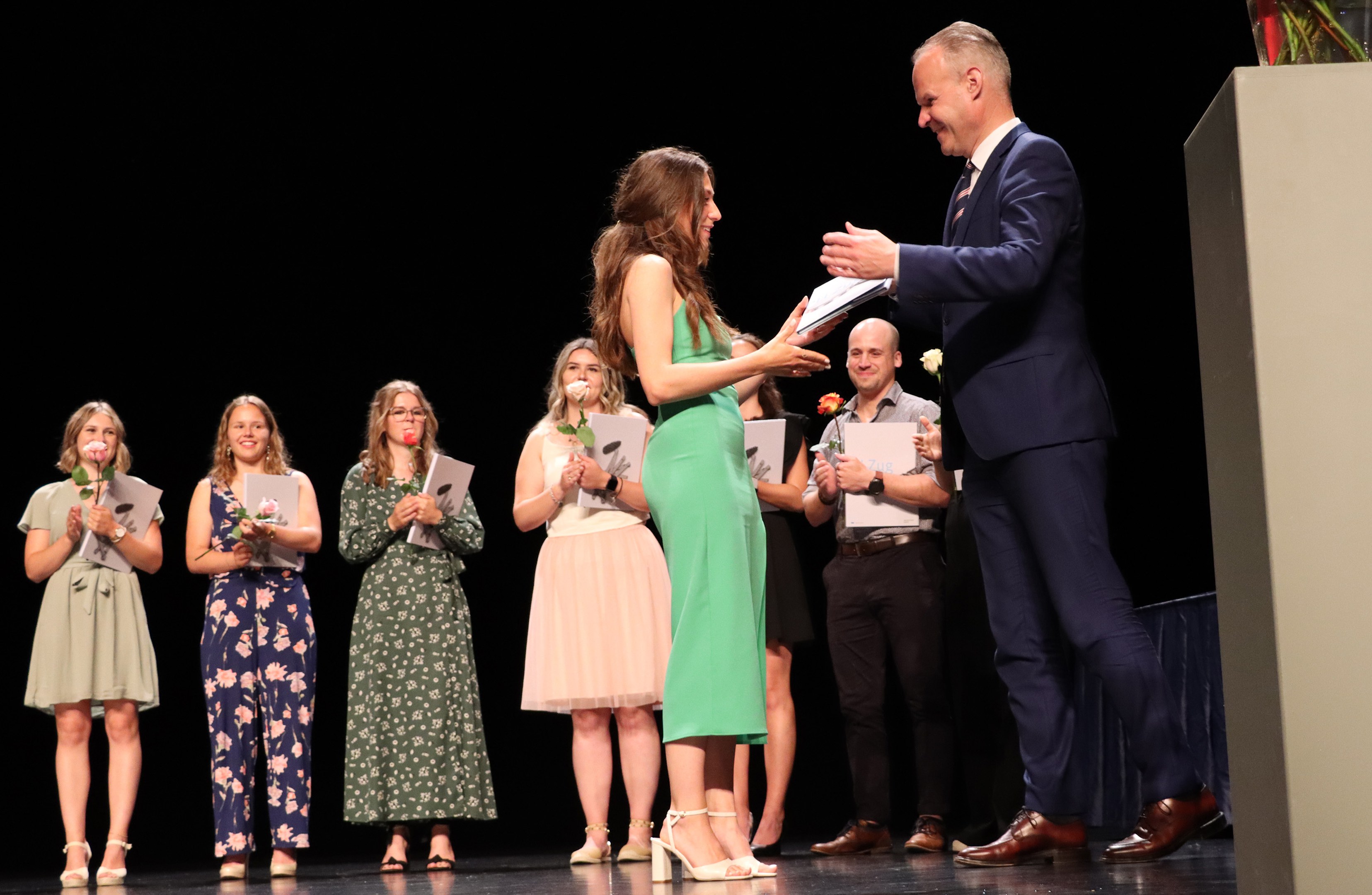 Moderiert wurde die Diplomfeier im Theater Casino Zug von Clemens Diesbergen, Prorektor und Leiter Ausbildung der PH Zug. Er führte durchs Programm und verdankte die Beiträge. Ein besonderer Dank kam der Studentin Elsa Nastase, die mit ihrer Geige und Klavierbegleitung den Auftakt wie auch den Abschluss der Feier gestaltete sowie den Studierenden des Abschlussjahrgangs mit der Vertiefung Musik, die die Feier mit Auszügen aus ihrem energiegeladenen Musical-Projekt bereicherten, zu. In ihrem Schlusswort wünscht auch die Rektorin Esther Kamm den Studierenden alles Gute für ihren beruflichen Weg und bedankte sich für deren Engagement im Studium.